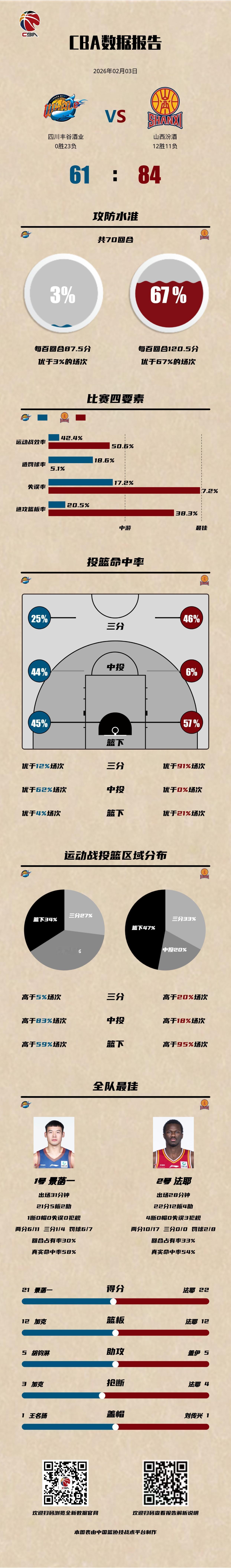 四川丰谷酒业 61-84 山西汾酒四川男篮vs山西男篮 四川丰谷酒业:景菡一21分5篮板,李玮颢14分5篮板,加克10分12篮板3抢断; 山西汾酒:法耶22分12篮板4助攻4抢断,盖伊17分5助攻2抢断,于米提11分3篮板。CBA数据库