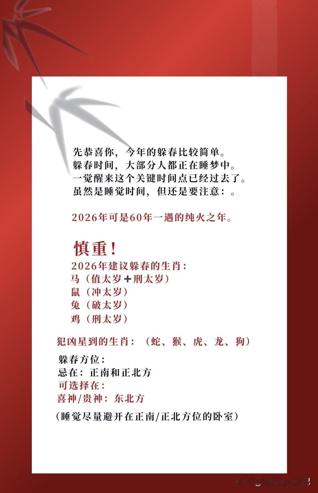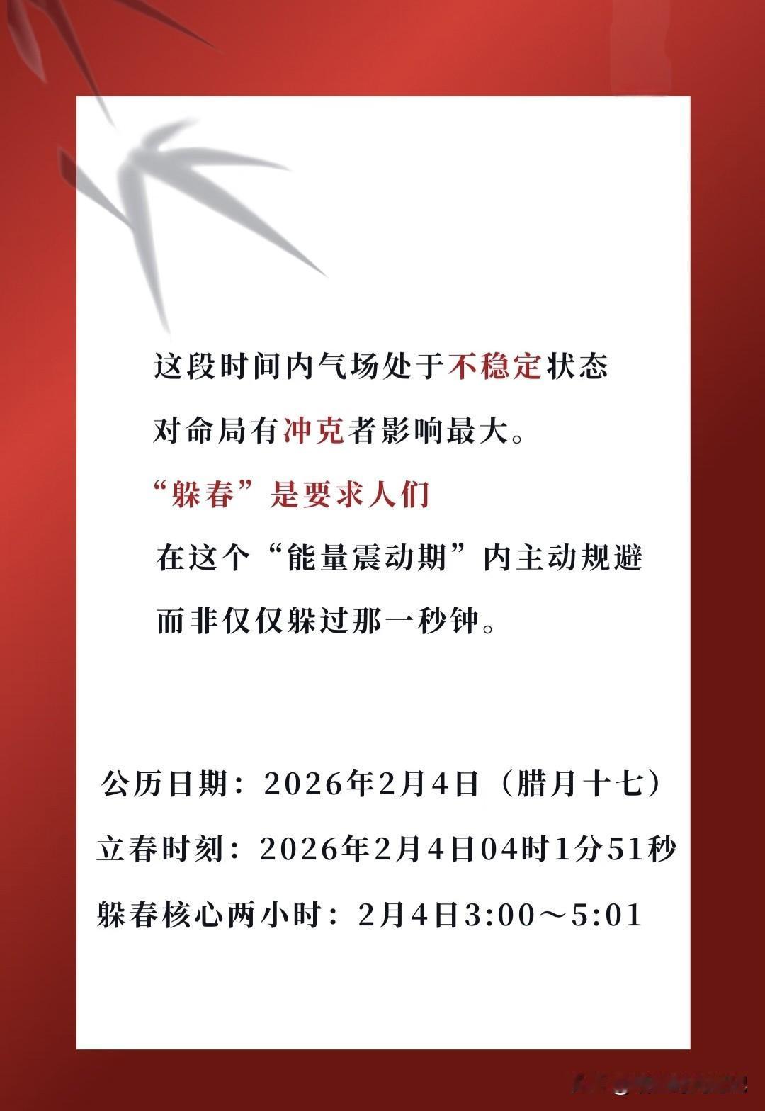 旧谚云「春朝定全年」,它既是二十四节气之首,也是丙午马年真正揭幕的号角。愿我们开好头,把2026年的日子过成一条平静又明亮的河。 今年立春落在2月4日清晨4点01分,若按“交节前后各一小时静守”的老规矩,躲春时段便是3:01-5:01。 恰好深眠时段,人已在梦里,不必额外折腾。 我曾见某派说法:躲春时禁言、禁卧、禁手机,仿佛如临大敌。 私以为,节气翻页、气场换手之际,核心只有四个字:静养避冲。 让身心慢半拍,减少情绪与外界的剧烈碰撞,替身体争取一段缓冲带。 既然睡眠本身就是“静”,那属马、鼠、牛、兔的朋友干脆拉严窗帘,安心躺平,梦里完成交接仪式即可。 一日流程(可抄作业) ① 日出即起,把被子枕头拎到阳光底下“杀毒”,顺便把懒虫也晒走。 ② 上午给银行卡喂一口“吉祥零钱”88、168、520,数字开心就好,让钱先热身。 ③ 拿抹布给搬家后没归位的物件擦擦脸,旧灰不除,新运怎么落脚? ④ 冰箱清仓、杂物断舍离,晚上顺手把垃圾带下楼,给新鲜空气腾位置。 ⑤ 全天开启“静音模式”:不抬杠、不吐槽、不翻旧账,把情绪调成“立春专用版”。 ⑥ 饭点犯愁?春饼卷万物,豆芽炒千般,咬下一口“生发”的味道。 ⑦ 不理发、不杀生、不钻墙、不搬家,让气场保持原装。 ⑧ 睡前或晨起,写一张“春日小纸条”:愿望三行,笔落心安。 ——🌱—— 节气是古人留给我们的“系统更新提示”。躲春、扫房、吃春饼,表面是仪式,内核是“主动让节奏慢半拍”,给身心一次软重启。信则认真玩,不信也当提前大扫除,反正房子干净了,心情不会太差。愿你我在马年立春,都能一键刷新,向阳运行。 「以上内容仅供娱乐参考,请各位读者保持理性判断,观看请自动开启"科学滤镜"喔~」