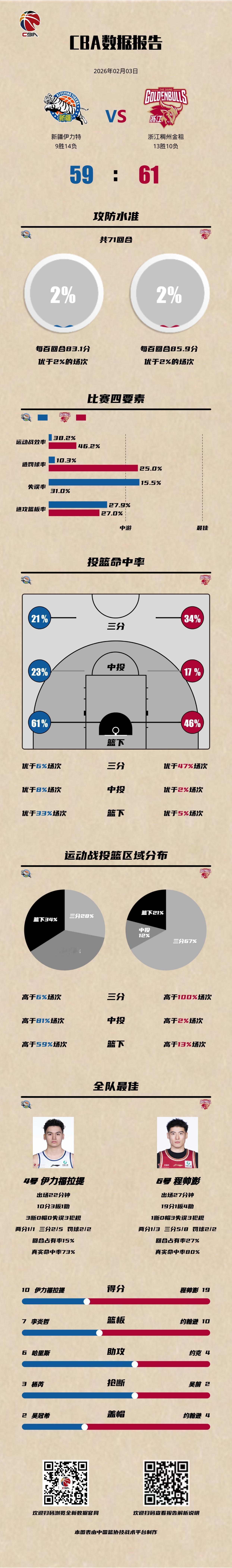 新疆伊力特 59-61 浙江稠州金租新疆男篮vs浙江男篮 新疆伊力特:伊力福拉提10分3篮板3抢断,吴冠希8分4篮板2盖帽,纳托尔8分3篮板; 浙江稠州金租:程帅澎19分4助攻,约翰逊11分10篮板3助攻4盖帽,陆文博10分4篮板。CBA数据库