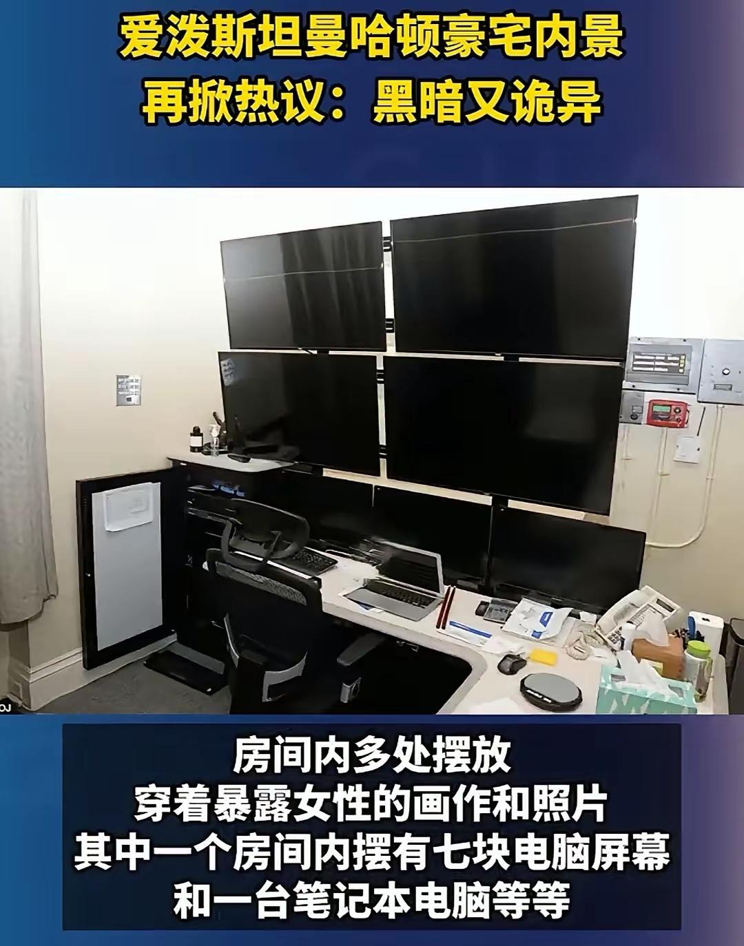 爱泼斯坦豪宅内部就这样被曝光了,装饰充满了神秘,有一种让人无法言说的邪恶感。 墙壁上到处都是女性裸露画作与写真,诡异的是大堂的吊灯装饰居然是一个穿着纱裙的黑色躯体荡在白绳上。 能在这种压抑氛围房子里长久居住的人,很难说得上心理正常。 最为诡异的是,他有一个秘密的房间里,在一张老板椅面前摆放了七块电脑屏幕,仿佛一张无形黑暗之网监视着一切。(图五) 这地方简直阴冷可怕,不知大家赞成吗?