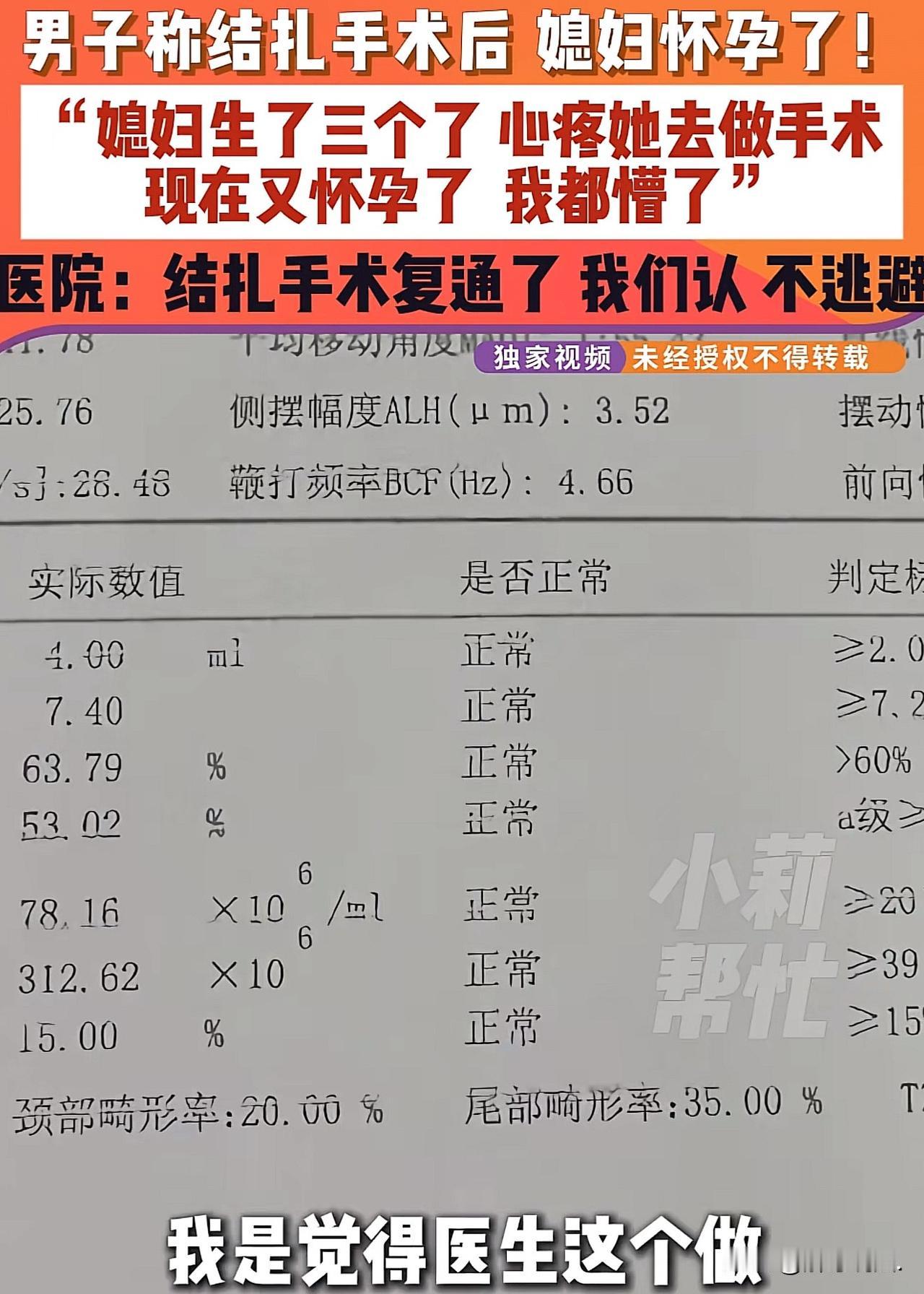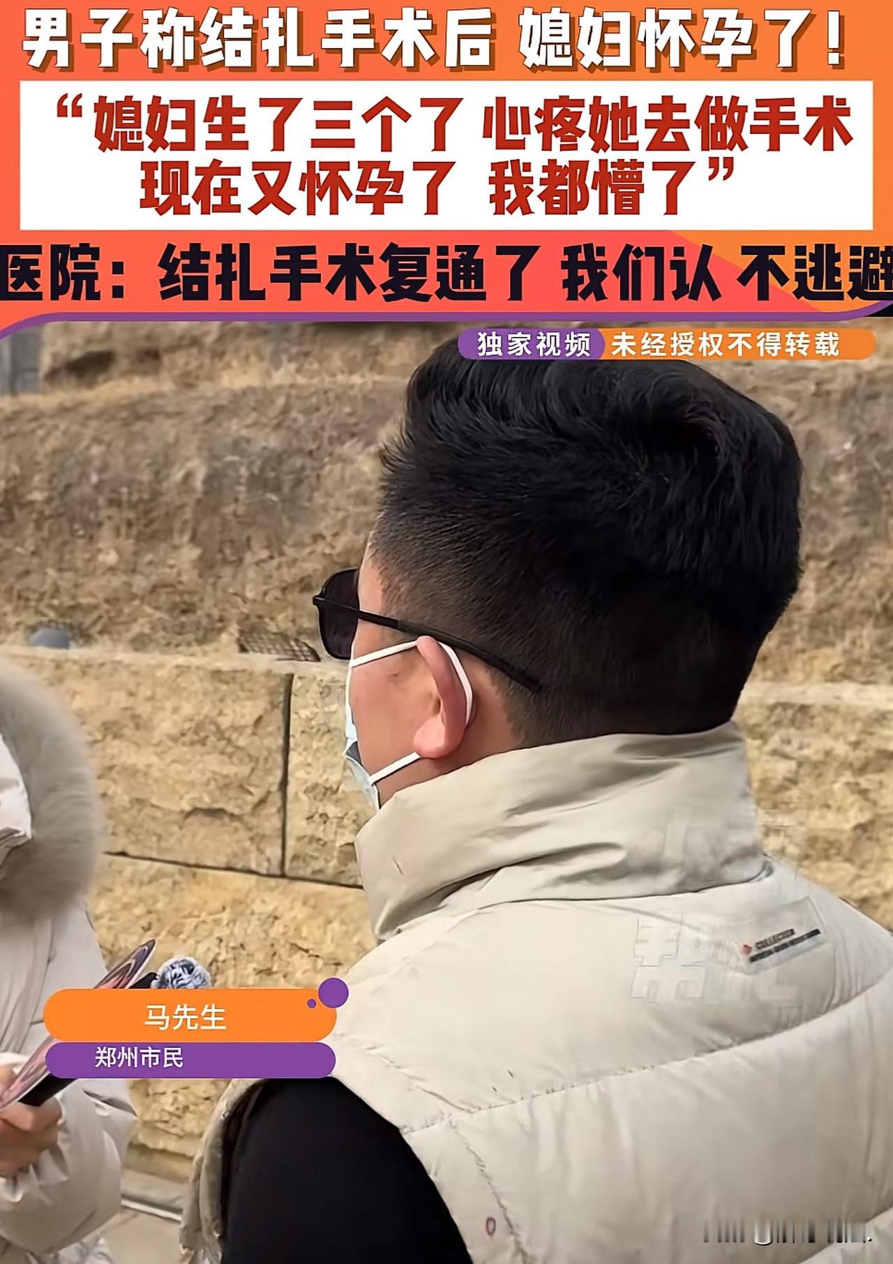 “这哥们好样的!”河南郑州,男子和妻子已经生下三胎,不想再生了。男子心疼妻子,于是,自己去医院做的结扎手术。术后一个月,医生告知不用避孕。谁知,11个月后,妻子竟怀孕了。男子懵了,自己做了结扎手术,怎么还怀孕了呢?他赶紧到医院去检查,结果,显示精子又正常了。男子气愤不已,找到医院讨要说法。男子问:我都做了结扎手术,妻子怎么又怀孕了?医院负责人说:我们也没法评定,结扎手术复通了,我们不逃避责任,希望协商解决!网友看热闹不怕事大:你都没怀疑其他的? 马先生的妻子怀孕了,他却满脸不高兴,一点没有即将为人父的喜悦,到底是怎么回事呢? 他告诉记者,其实他早就做了结扎手术,此话一出,让人不免在心里打个问号了,结扎怎么还能怀孕呢?不免有人替马先生捏了一把汗! 原来,马先生家已经有三胎了,养3个孩子压力已是不小,于是夫妻俩决定不再要孩子。 但马先生心疼妻子,毕竟做结扎手术也是要遭罪的,于是,他自告奋勇,决定自己去做结扎手术。 2025年1月23号,马先生特意选了郑州第三人民医院,正规医院,技术肯定靠谱,心里也踏实。 到了医院,各项检查、术前准备都按流程来,手术做得也挺顺利,马先生想着这事儿总算尘埃落定了,以后不用再为避孕的事儿操心,也能让媳妇安心,心里还挺高兴。 术后一个月,他去医院复查精子情况,医生说检查结果显示2%没有精子了,情况挺好的。 他回到家后,还是有点不放心,又通过微信和医生确认,医生明确告诉他以后不用避孕了,马先生这才把心放到肚子里。 万万没想到,2025年12月份,其妻子“大姨妈”迟迟没来串门!赶紧买来验孕棒,这一测,二道红杠,坏了,怀孕了! 马大哥脑袋“嗡”的一声,直接就懵了:不可能啊,绝对不可能!自己都做了结扎手术了,复查还说没精子了,咋还能怀上呢? 他赶紧又跑到医院去做检查,结果,显示他的精子状态正常。 马大哥气愤不已,这叫什么事啊?手术做了,罪也受了,最后媳妇儿还是意外怀孕了, 这可怎么办,生吧,家里有3胎了,不生吧,妻子还要遭罪,再说也不忍心啊! 马大哥越想越气,这才找来媒体曝光此事。 他要求医院给自己个说法。 随后,记者拨通了医院的电话号码,当马先生问:为什么我做了结扎手术,媳妇还会怀孕呢? 医生说:这个不是我们能评定的,结扎手术不是已经复通了吗? 好在,对方没有逃避责任,表示愿意承担责任,希望进行调解处理。 此事曝光后,有网友给马大哥点赞了:没有怀疑妻子瞎搞,先是找医院求证,是个好男人! 也有网友说:男性结扎只是精子存活率低 ,但不会百分之百不能怀孕的。 《民法典》第1218条规定:患者在诊疗活动中受到损害,医疗机构或者其医务人员有过错的,由医疗机构承担赔偿责任。” 具体到马先生的情况,他做结扎手术的核心目的就是避孕,而且术后复查时医生明确告知手术效果良好、无需再避孕,最终却出现意外怀孕,这说明手术并未达到预期的诊疗效果。 如今手术失败导致妻子意外怀孕,无论对马先生夫妻的身体还是精神都造成了损害,医院应当承担相应的赔偿责任,比如承担终止妊娠的医疗费用、营养费、精神损害抚慰金等。