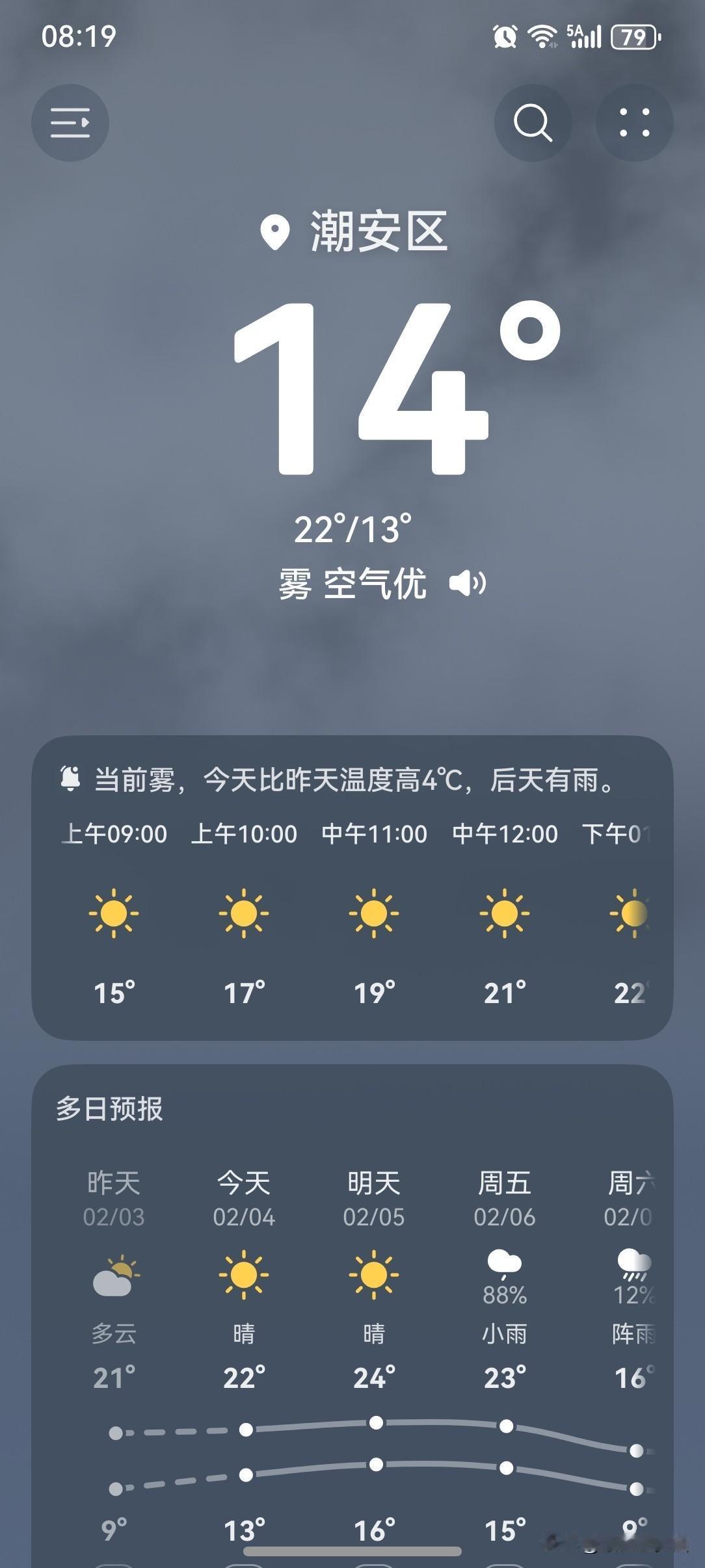 今日立春!标志着这一年的四季轮回重新始,气温渐暖,白昼变长,万物复苏,生机勃勃。 广东气温继续回升,又拿到了冬日暖阳体验卡!不过,周末(6日夜间),冷空气回马枪又来了。 4~6日白天,广东大部晴转多云,气温继续回升,早晚有轻雾或雾,其中,西部市县4日夜间~5日局部有小雨;6日夜间起新一股冷空气开始进入我省,并伴有分散小雨。 近期广东的天气节奏变化较快,需要密切留意天气预报,根据气温变化适时增减衣物,别让感冒病毒有机可乘! 今天(4日),潮州依然喜提一个大好晴天!气温13~22℃,此刻气温14℃,体感温度11℃。 一起来看看今天的天空吧!今天的云量比昨天多了一些,阳光露不了脸,幸好隐约可见! 气温方面,跟昨天差不多,略有上升趋势,依然是暖和的一天! 不知不觉又到了立春的节气啦!今天的天气颇有几分春天的味道。早上有雾,空气较湿润。 北方的立春象征着气温的回升,万物复苏!但作为广东人,我们是怕极了春天的到来,因为春天会有回南天! [我想静静][大笑][笑哭][捂脸][我想静静][大笑][笑哭][捂脸]
