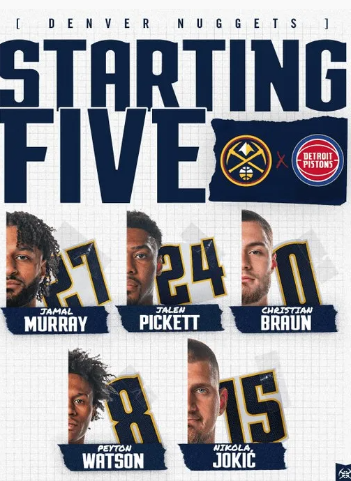 NBA常规赛,掘金对阵活塞。 掘金官方更新了伤病报告: 掘金首发:默里、布劳恩、