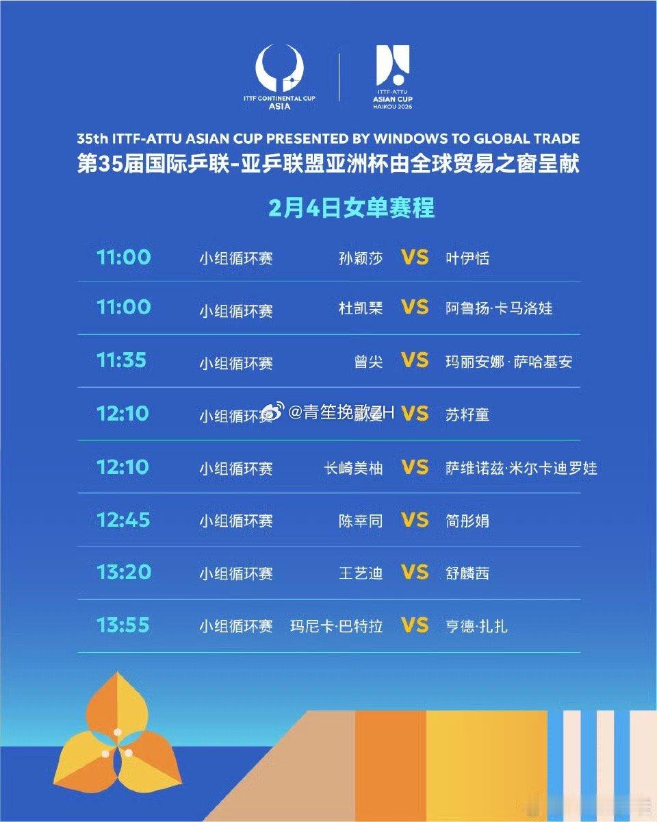 海口亚洲杯2月4日赛程晚间18点35分T3台陈熠对阵奥拉万·帕拉南,陈熠身高优势突出,护台面积大,对手是泰国选手,擅长近台快变,陈熠要利用身高优势压制对手,以稳健防守配合突击得分。陈熠加油⛽海口亚洲杯今日开赛海口亚洲杯2月4日赛程
