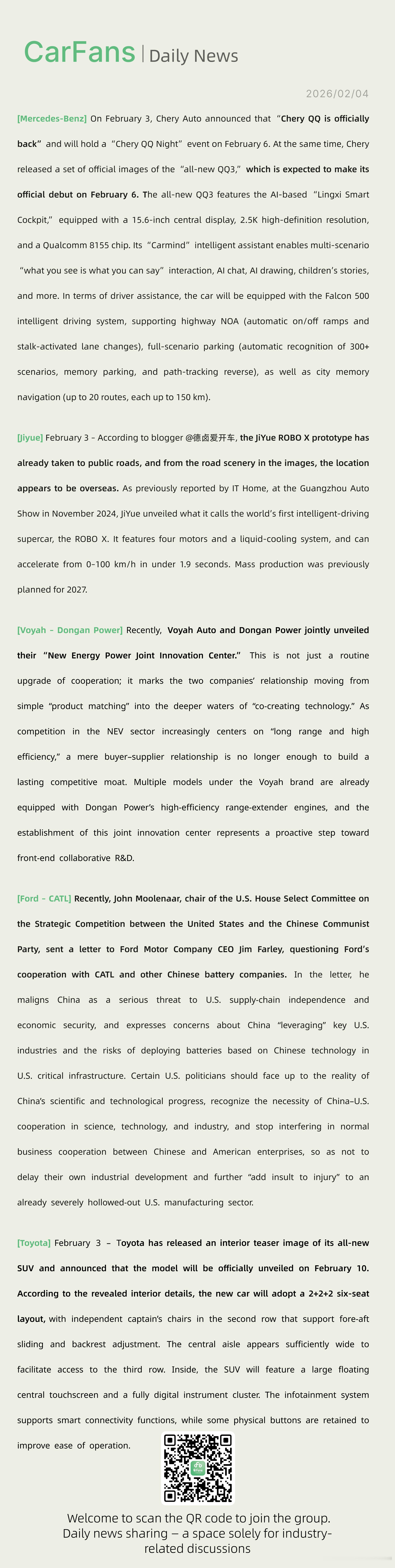 奇瑞汽车今日宣布“奇瑞QQ正式回归”、美国众议院就福特与中国电池企业合作进行质询日前,美国众议院中国事务特别委员会主席约翰·穆勒纳尔致信美国福特汽车公司首席执行官吉姆·法利就福特与宁德时代等中国电池企业的合作情况进行质询。