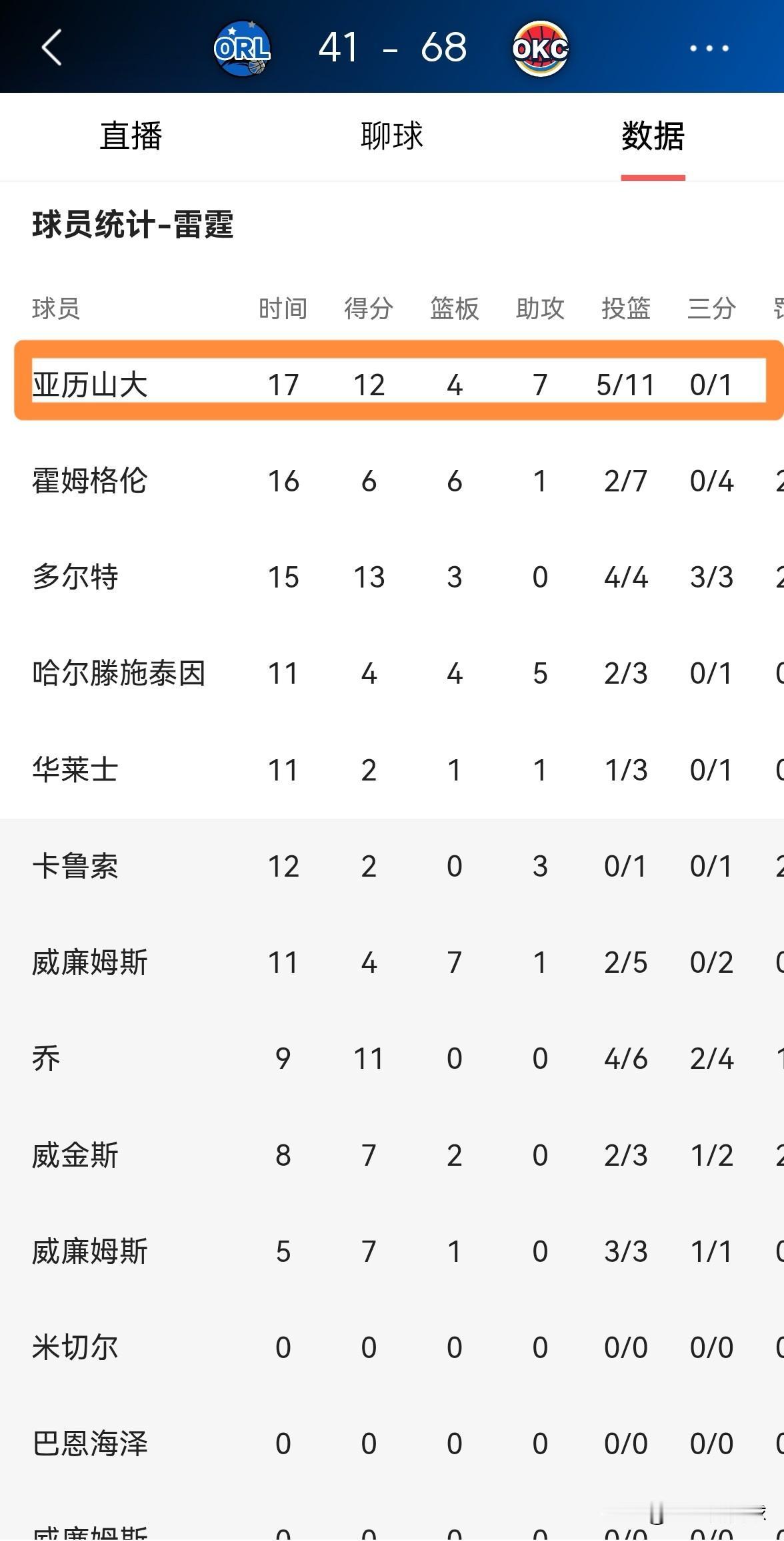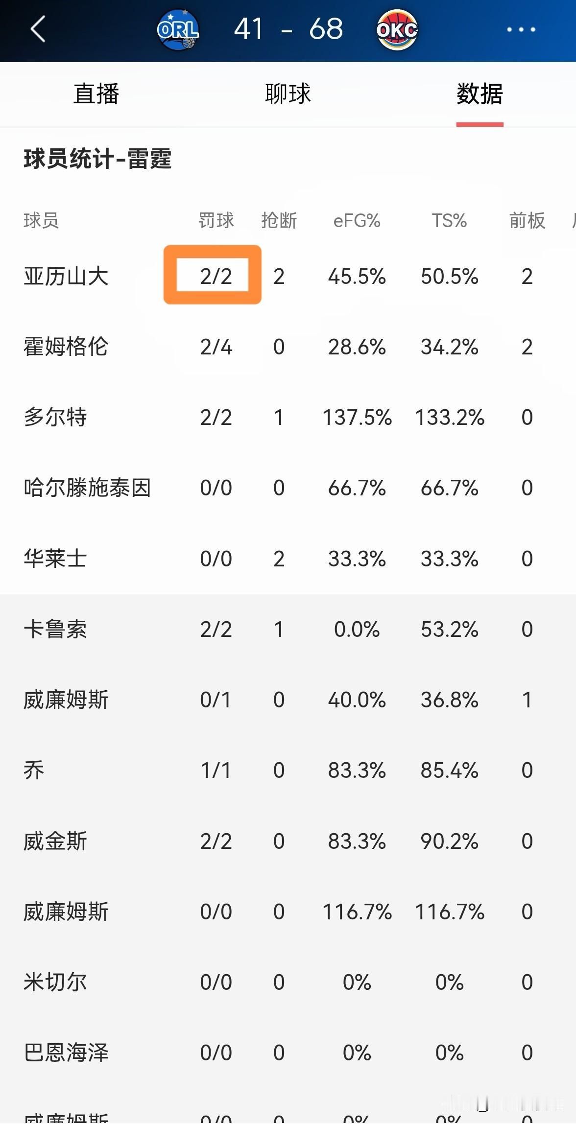 雷霆超级巨星亚历山大的罚球数真是少的可怜!在今天雷霆主场迎战魔术的比赛中,目前双方半场战罢,雷霆以68:41领先对手。让人感到无比意外的是,在上半场比赛中,亚历山大仅仅得到了2次罚球。 在前两节比赛中,亚历山大首发出战17分钟,投篮11中5,其中三分球1中0、罚球2中2得到12分,外加4篮板7助攻2抢断,他的场上正负值为+21。 实事求是的说,作为当今NBA排名前三的球星,亚历山大在17分钟的上场时间里仅仅得到2次罚球是非常不正常的,联盟必须反思自己了。