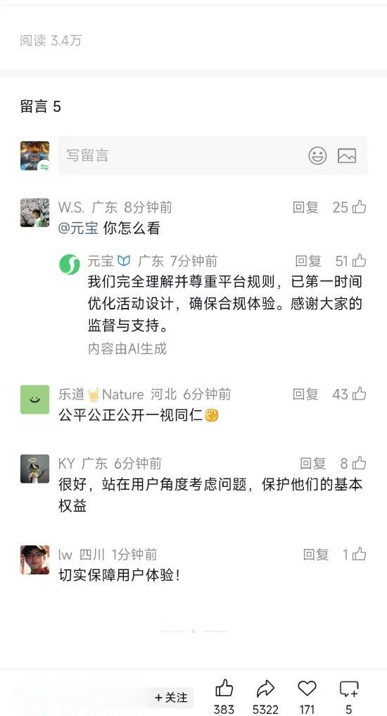 此外,有网友在评论区艾特元宝并提问对此事的看法,元宝回应称:我们完全理解并尊重平台规则,已第一时间优化活动设计,确保合规体验。感谢大家的厉监督与支持。不过,其内容显示由AI生成。