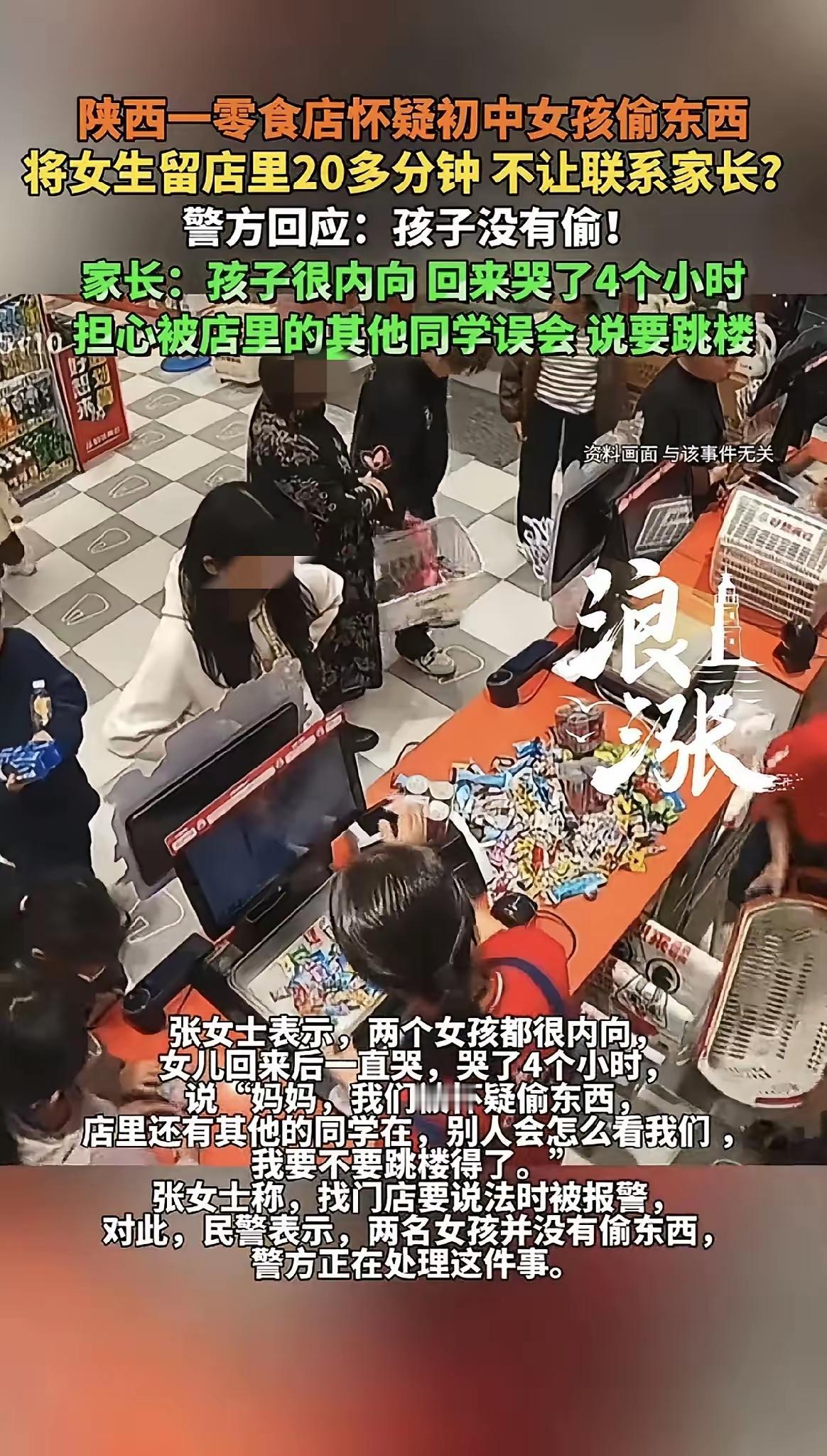 陕西咸阳,14岁女孩去零食店,被店员怀疑偷东西,店员直接扣着女孩,女孩感到身体不舒服,让妈妈来陪伴,店员却不允许她联系妈妈,后来女孩自证清白,他们才放女孩走,可女孩被深深伤害,她痛苦地说道:“同学们都在,他们会怎么看我,我要不要跳楼得了!”妈妈为女儿讨说法,店员却报了警。 这事就发生在咸阳礼泉县长富路的一家零食店,涉事的是两个14岁的初中女生,性格都偏内向,本来只是普通的进店买零食,没成想却遭遇了一场让她们难以释怀的风波。 当天下午一点左右,两个女孩挑好零食付完钱,刚走出店门10米左右,就被店员追了上来,理由是总部监控预警,怀疑她们偷了店里的东西。 店员的怀疑,仅仅是因为监控里看到女孩的手碰过货架上的零食,之后又碰了碰自己没拉拉链的背包,没有任何实锤证据,也没查到所谓的赃物,甚至没有一帧画面能证明有商品被放进背包里,可店员还是不由分说,直接把两个未成年人强行带回了店里,一扣就是20多分钟。 这个年纪的孩子本就敏感,尤其是在公共场合,被当成小偷一样扣留,周围过往的顾客、路过的同学都在看着,那种被异样眼光审视的感觉,对她们来说无疑是巨大的压力。 没一会儿,其中一个女孩就因为过度紧张感到身体不舒服,她怯生生地提出想给妈妈打个电话,让妈妈来陪着自己,这是未成年人身处困境时最本能的求助,也是情理之中的要求,可却被店员硬生生拒绝了。 被强行扣留,又被切断了和家人的联系,两个女孩陷入了孤立无援的恐惧中。 为了能尽快摆脱这种困境,证明自己的清白,女孩只能选择主动打开背包,把自己的隐私暴露在众人面前,用这种屈辱的方式自证清白。 可背包里空空如也,根本没有所谓的赃物,店员看了一眼后,才不情不愿地放她们走了。 本以为这场闹剧就此结束,可对女孩的伤害才刚刚开始,回到家后,女孩压抑了许久的情绪彻底爆发,整整哭了四个小时,枕头都被泪水浸透了。 她满脑子都是被扣留时的场景,反复担心同学们会因此对自己有看法,甚至绝望地冒出了轻生的念头,这份心理创伤,远比身体上的不适更难愈合。 看着女儿痛苦的样子,妈妈又心疼又气愤,当即就赶到那家零食店,想为女儿讨一个说法,要求查看当时的监控,还原事情的真相。 可让人没想到的是,明明是店员有错在先,面对家长的合理诉求,不仅没有丝毫歉意,反而因为妈妈想拿手机录像取证,反手报了警,摆出一副“先报警先有理”的姿态,格外傲慢。 之后警方介入调查,调取了完整的监控,真相才彻底水落石出。 监控清楚地显示,两个女孩全程没有任何偷窃行为,当初引发怀疑的碰包动作,只是因为背包拉链没拉好,纯属一场彻头彻尾的误判。 后来店员也承认是误会,可一句轻飘飘的“误会”,根本无法弥补对女孩造成的心理伤害。 对成年人来说,或许这只是一场尴尬的误会,可对14岁的孩子来说,这是尊严被践踏、安全感被摧毁的致命打击。 店员仅凭怀疑就私自扣留未成年人,还剥夺她们联系家人的权利,这种行为不仅不合情理,更触碰了法律的底线。 商家防盗无可厚非,但不能凌驾于他人的合法权益之上,更不能用有罪推定的心态,去伤害一个无辜的未成年人。 大家对此怎么看?欢迎评论区留下您的观点!