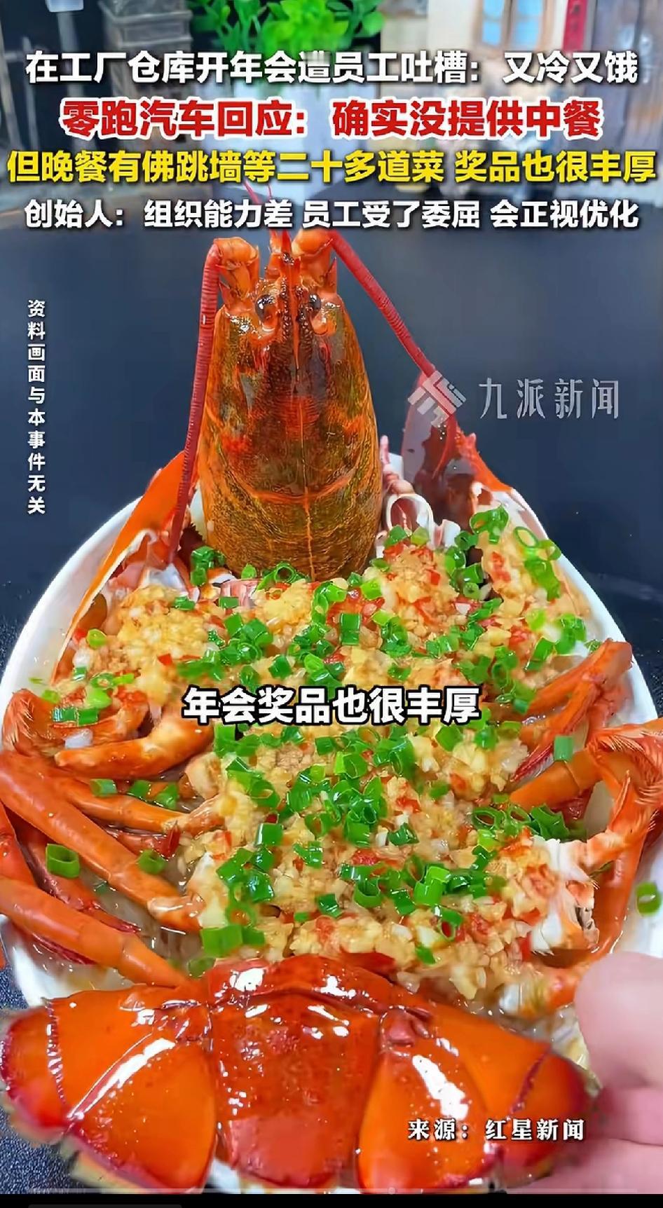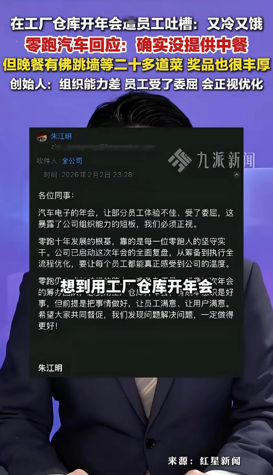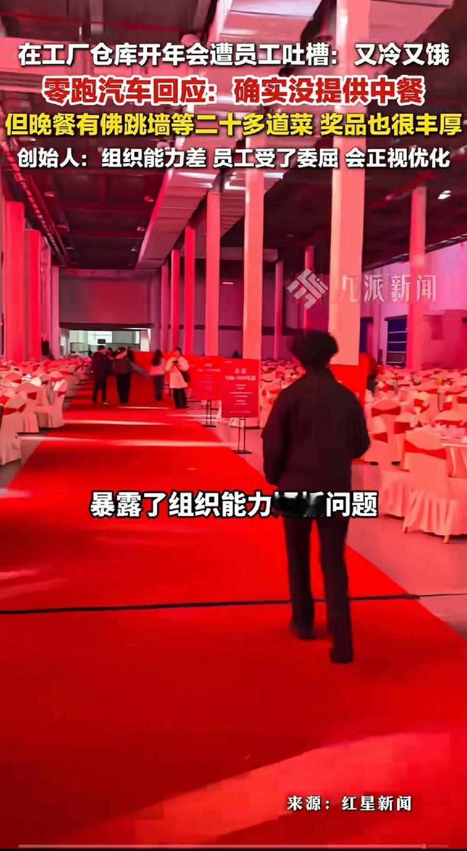 零跑汽车办年会,遭员工吐槽:又饿又冷还没有午饭。 零跑汽车回应:确实没有提供午饭,但晚餐有佛跳墙等二十多道菜,奖品也很丰厚。 董事长朱江明深夜发布全员信,承认组织有短板,还启动全面复盘。 不过呢,有参会者说网传和实际有出入。年会下午3:30才开始,“中午不管饭”存在时间误读,现场还有水果、零食、白酒和热菜晚餐,龙虾都安排上了,抽奖中奖率超30%,奖品有20台iPhone 17、10克纯金条。 看了奖品和时间都没什么问题,估计还是场地选择让工人不太满意,场地简陋工人穿的太厚还觉得冷,体验感不好。 看来除了冷是真的,很多信息被夸大了。零跑正处在业绩高光期,希望能吸取这次年会的教训,把员工体验提上去