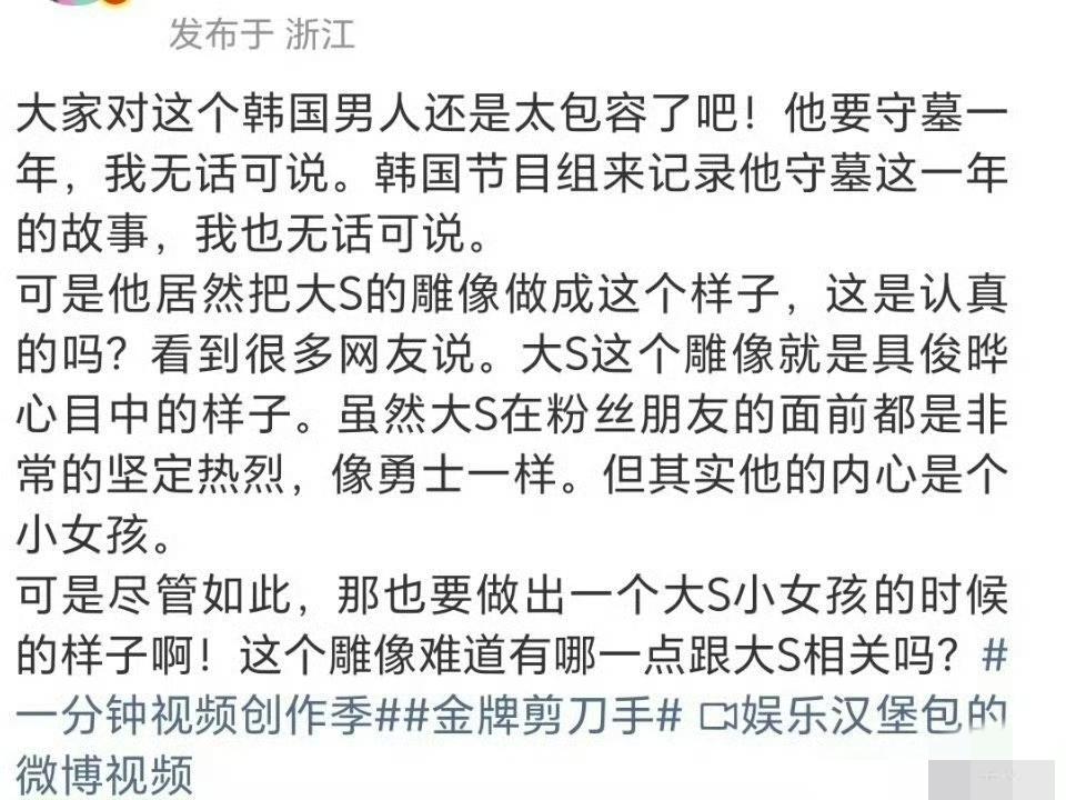 具俊晔在大S墓前录综艺,是深情还是作秀?网友吵翻了 大S去世快一年,具俊晔天天去墓地一坐一整天,本来大家都夸他重情重义,结果被曝全程在录韩国综艺,一拍就是一整年,这下彻底炸锅了。 有人说,人家本来就常去陪伴,节目组只是跟拍记录,雨中跪拜、哽咽说“熙媛更辛苦”,看着是真心疼。也有人直怼:悼念就安安静静,把墓地变片场,镜头怼着拍,主持人跟着哭,这哪是怀念,分明是拿逝者博流量、赚收视率。 更有意思的是,他还主动放弃遗产,全留给孩子,一边是深情举动,一边是综艺跟拍,让人看不懂到底是真情流露,还是精心设计的人设剧本。 悼念本是很私人的事,拍成综艺播给全世界看,你觉得合适吗?真心陪伴,还是消费逝者? 具俊晔在大S墓前录综艺 大S去世一周年 娱乐圈深情人设 你觉得具俊晔是真深情还是在演戏?来评论区说说你的看法!