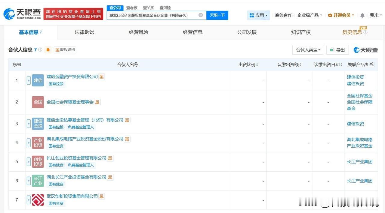 【湖北社保科创股权投资基金登记成立 出资额200亿】 天眼查App显示,近日,湖北社保科创股权投资基金合伙企业(有限合伙)成立,执行事务合伙人为建信金投私募基金管理(北京)有限公司、长江创业投资基金管理有限公司,出资额200亿人民币,经营范围为创业投资,以私募基金从事股权投资、投资管理、资产管理等活动,由建信金融资产投资有限公司、全国社会保障基金理事会、湖北集成电路产业投资基金股份有限公司等共同出资。 天眼查信息: