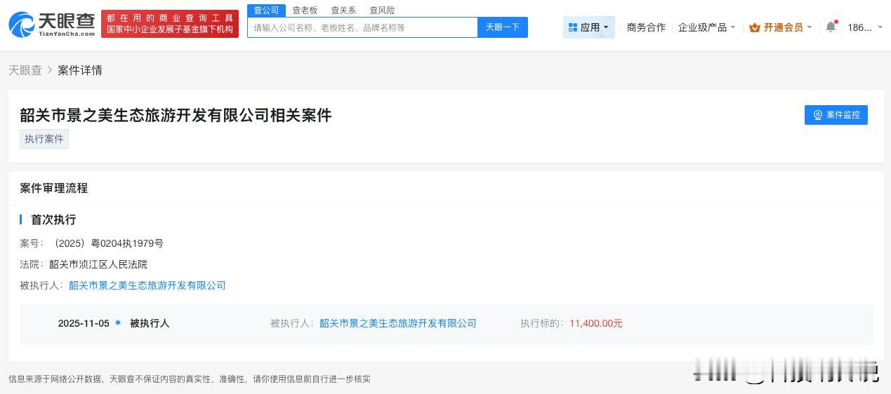 【华南虎园去年曾被执行 揭秘华南虎园关联公司】华南虎园一豹子腹部现肉眼可见大洞 2月2日,游客在广东韶关华南虎园拍下一只豹子腹部有可见肌肉的洞状伤口。2月3日,韶关华南虎园工作人员回应,已联系专家为其治疗。公开信息显示,华南虎园关联公司为韶关市景之美生态旅游开发有限公司。 天眼查App显示,韶关市景之美生态旅游开发有限公司成立于2013年4月,法定代表人为谢晓霞,注册资本300万人民币,经营范围包括园区管理服务、动物园管理服务、野生动物保护等,由谢晓霞全资持股。值得一提的是,去年11月,该公司曾被执行1.14万元。 天眼查信息: