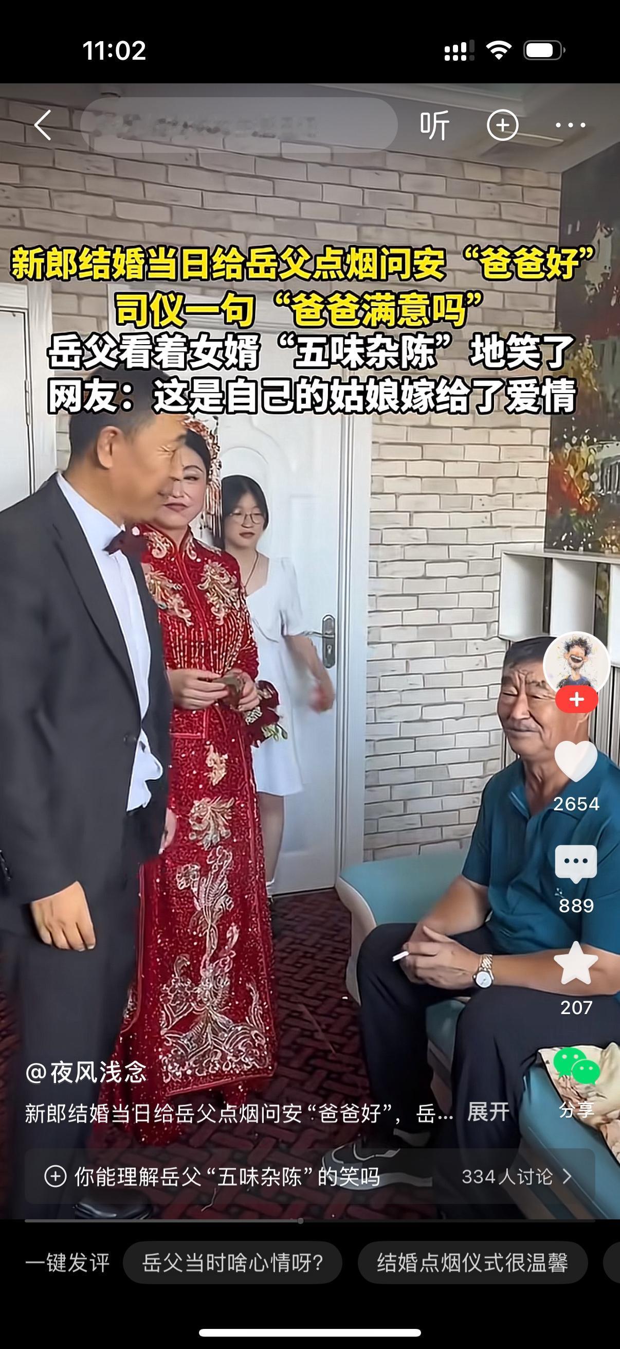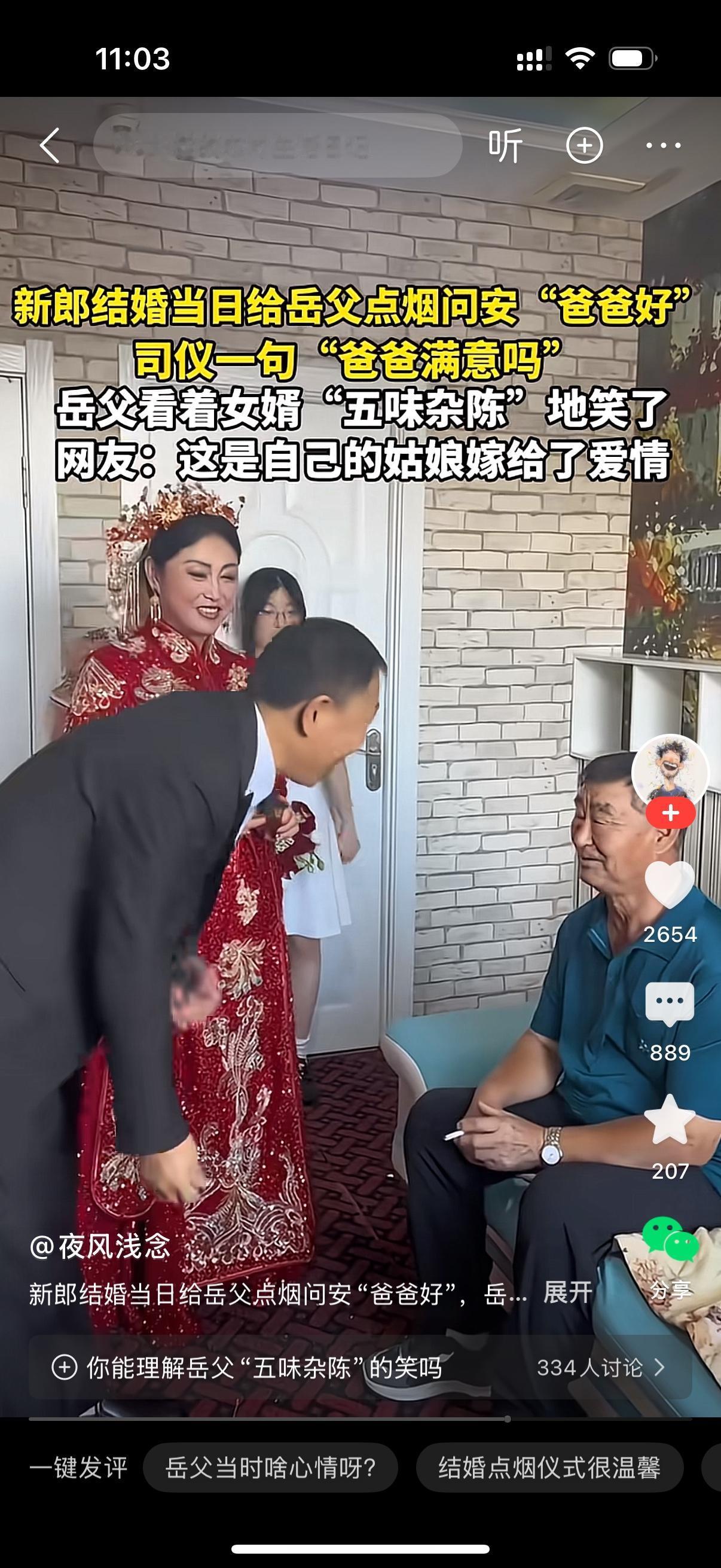 结婚当日,新郎给岳父点烟问安“爸爸好”。新郎不太好意思,声音有点小,司仪提醒他声音大点,重新喊一遍。新郎弯腰再给岳父点烟,恭敬的喊了一句,爸爸好。现场一片欢愉。只有岳父看着女婿,心里五味杂陈地笑了。这姑娘一定是嫁给了爱情。