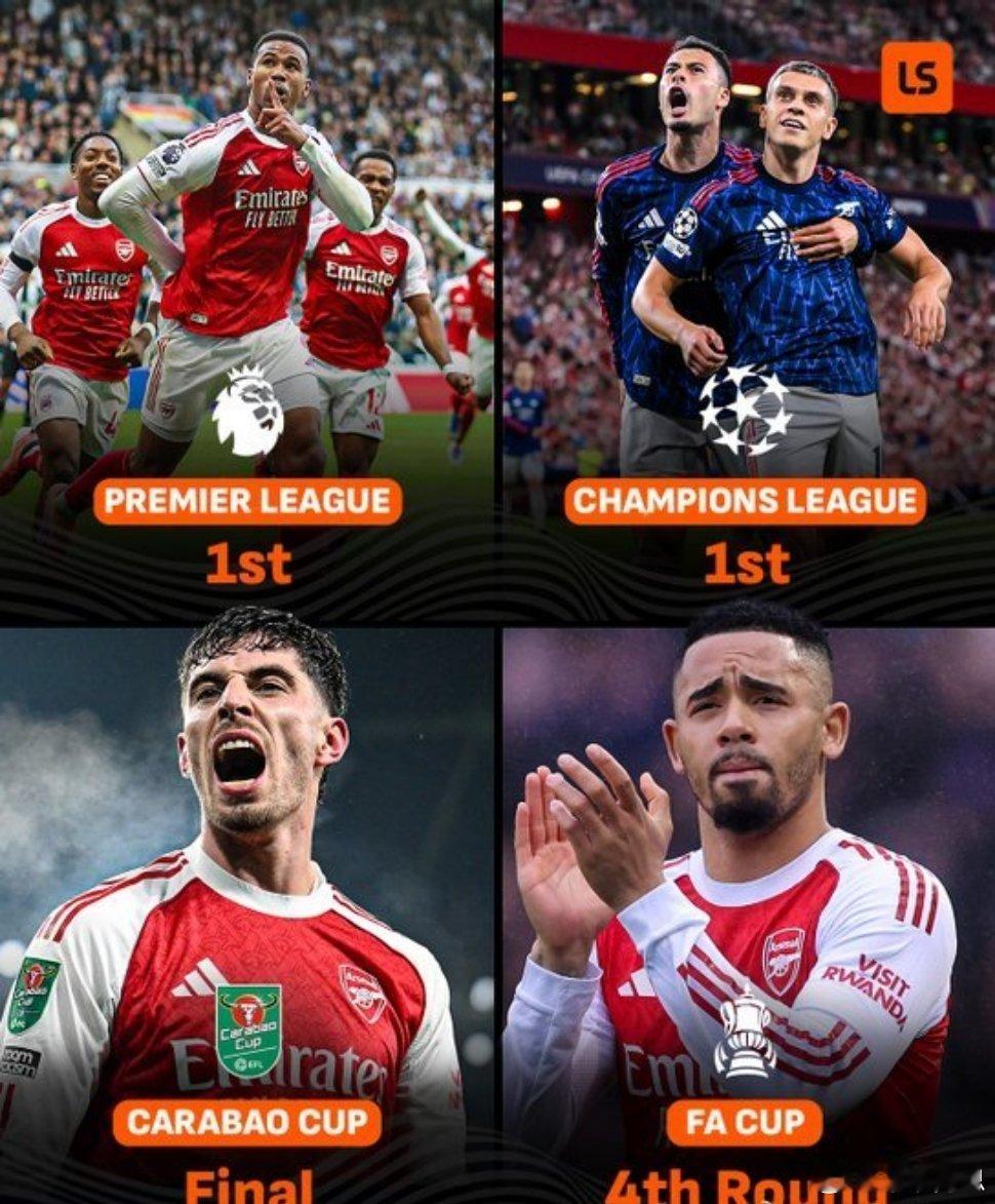 英超:24轮排名第一,领先曼城6分欧冠:联赛阶段全胜头名出线,晋级16强足总杯:晋级32强联赛杯:晋级决赛