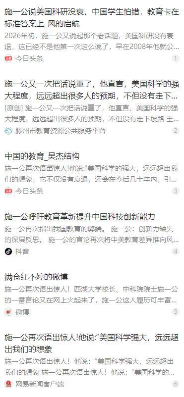 施一公再次语出惊人?他说:“美国科学的强大,远远超出我们的想象,它不仅没有衰退,还会在今后几十年内,引领世界的发展!”而这其中最关键的原因,就在于中美教育的差异:“我们的教育,太过于抑制学生的创新能力!”一针见血,振聋发聩! 麻烦看官老爷们右上角点击一下“关注”,既方便您进行讨论和分享,又能给您带来更多优质的内容,感谢您的支持! 最近,西湖大学校长、中科院院士施一公的一段关于中美科研与教育的观点,再次在网络上引发广泛讨论。作为同时深耕中美两大科研与教育体系的资深学者,他的看法一直备受关注,这次也不例外,相关内容很快成为教育与科技领域的热议话题。 施一公明确提出,美国科学的整体实力,远比很多人直观感受到的更加强大,并不像近些年部分舆论所说的那样正在走向衰退。他结合长期观察判断,未来几十年里,美国在基础科学与前沿科研领域,仍会保持显著的全球影响力与引领地位,这一判断也打破了不少人对美国科研走向的乐观预判。 这一观点之所以引发争议,很大程度上是因为过去十多年间,国内舆论场频繁出现美国科研实力下滑、创新动力不足的说法。支持这类判断的依据不少,包括国内关注到的美国国内政治极化、科研经费分配博弈、产业与学术衔接波动、部分领域人才流动变化等,这些现象也确实被多家国际媒体与研究机构提及。 但施一公并未简单附和这类流行判断,而是坚持从一线科研实践出发给出不同看法。他拥有在美国顶尖高校长期任教、主导实验室研究,以及回国参与高校管理、筹建新型研究型大学的完整经历,对两套体系的运行逻辑、人才培养模式、创新生态差异都有直接体会。 他多次强调,自己的相关表述并非情绪化表达,也不是刻意否定国内发展成果,而是基于数十年科研与教育实践的客观观察。他希望通过直白的对比,提醒国内关注科技竞争的核心短板,而非单纯评判优劣,这种立场也贯穿在他多年的公开演讲与文章中。 在解释美国科研长期保持优势的关键原因时,施一公把焦点放在了中美教育的系统性差异上。他直言,国内教育长期以来更注重选拔效率与标准化培养,从基础教育到高等教育,评价体系高度绑定考试分数、升学排名、短期成果产出,这套体系能稳定培养大量基础扎实的优秀学生。 但这种模式也带来明显副作用,在潜移默化中抑制了学生的独立思考与原创探索能力。学生更习惯遵循既定路径、追求标准答案、规避风险选择,很少主动挑战未知领域,也较少被鼓励提出颠覆性问题,而这正是基础科学突破所必需的核心素养。 这种教育导向也传导到科研领域,使得不少研究更倾向于选择低风险、易出成果、容易获得经费支持的方向。大家更愿意跟进成熟领域、优化已有技术、完成增量改进,而很少有人敢于投入长期不确定的原创性探索,这在一定程度上弱化了整体科研的创新张力。 施一公多次提到,美国教育与科研体系的优势,并不只在于经费充足、设备先进,更在于对不确定性的包容、对失败的宽容、对独立思考的尊重。从中学到大学,再到科研机构,都更鼓励学生提出不同意见、尝试非常规思路、坚持长期冷门方向,这种氛围支撑了持续的源头创新。 他也明确表示,自己指出国内教育的问题,并非否定中国教育的成就。过去几十年,国内教育体系快速普及、大幅提升全民素质、培养了数以亿计的专业人才,支撑起工业化与科技进步,这些成就有目共睹,也是未来改革升级的重要基础。 他想强调的是,在面向未来的科技竞争中,仅靠标准化培养与高效选拔已经不够。当发展进入需要更多原始创新、颠覆性技术的阶段,教育体系必须做出调整,减少对标准答案与既定路径的依赖,给学生更多试错空间、更多自主选择、更多探索自由。 针对美国科研是否真的不会衰退的疑问,施一公也给出过补充解释。他认为美国科研的强大是生态层面的,包括全球人才汇聚机制、学术自由氛围、成果转化链条、长期稳定投入、高校与产业协同等多个环节共同作用,不会因为短期波动轻易改变整体格局。 同时他也提到,美国科研同样面临自身问题,比如阶层固化影响教育公平、部分领域过度商业化、学术评价也存在功利化倾向等,这些问题也在制约其发展,只是整体生态优势仍较突出,短期内难以被全面超越。 对比之下,国内科研在投入规模、论文数量、工程技术应用等方面进步极快,部分领域已经达到国际先进甚至领先水平,但在基础科学原创、底层技术突破、顶尖人才引领力等方面,仍存在明显差距,而差距的根源很大程度上要追溯到教育前端。 施一公的这番观点,之所以每次都能引发强烈反响,正是因为戳中了很多教育工作者、科研人员与家长的共同感受。大家都能感受到,学生很会考试、很会解题,但提出新问题、开辟新方向、坚持长期探索的能力相对不足,创新的勇气与底气有待加强。