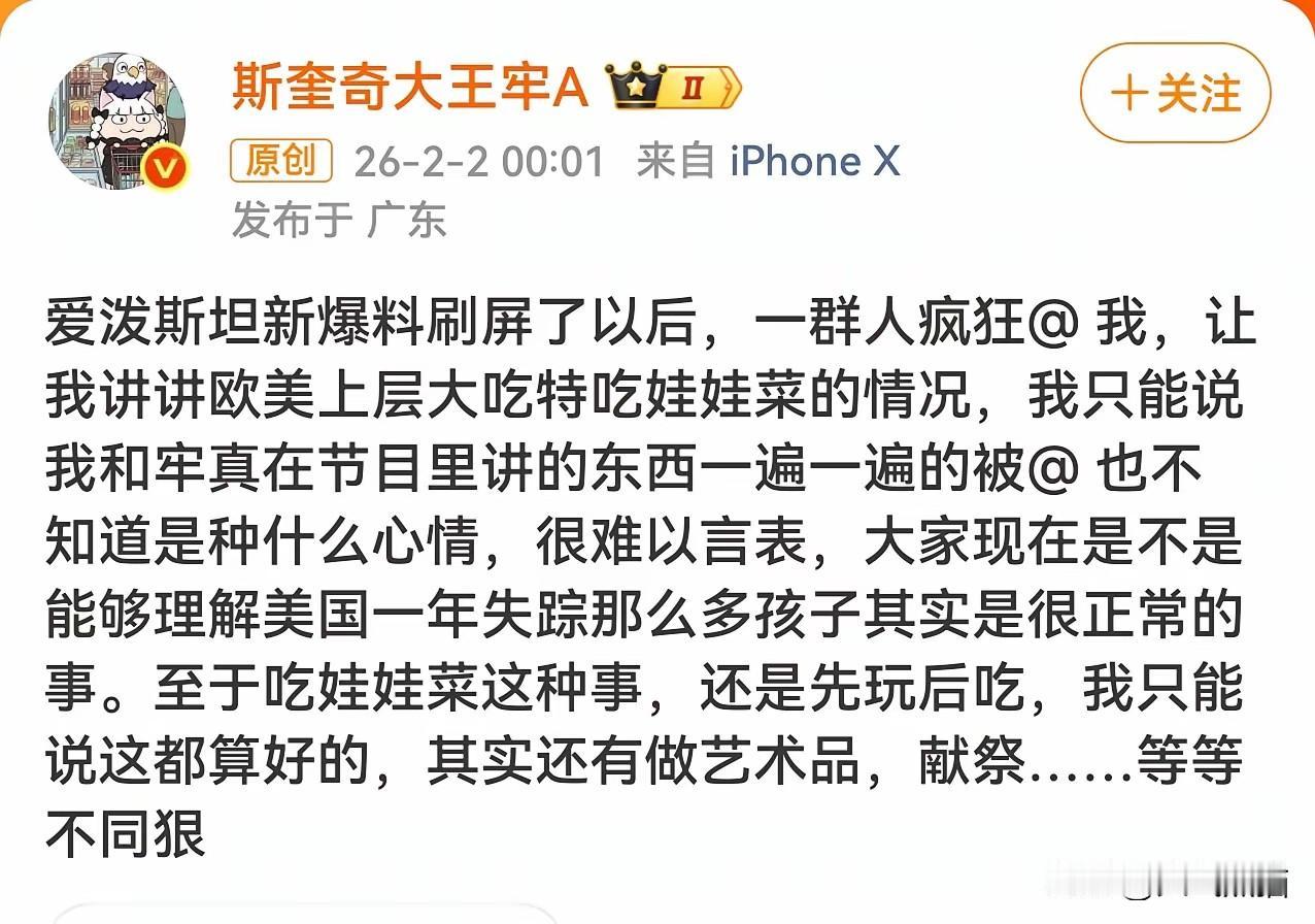 牢A评论爱泼斯坦一案,也是太敢说了。 他直言不讳的说道,美国一年失踪那么多孩子其实是很正常的,娃娃菜都算好的,还有大家更想象不到的,这真是有点颠覆了所有人的认知。 真的让人难以理解这一群,所谓的“上层”,竟然有这种癖好,这难道就是地位达到一定的高度,心里极度的空虚吗,还是说就是天生没有良心啊!
