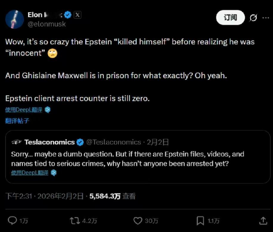 昨天,看热闹不嫌事大的马斯克发文:“哇,爱泼斯坦居然在意识到自己‘清白’之前就‘自杀了’,这也太离谱了。而吉斯莱恩·麦克斯韦尔(爱泼斯坦前女友,被指控协助爱泼斯坦性侵未成年少女而被定罪)究竟又是因为什么入狱的呢?哦对了,爱泼斯坦地客户们被逮捕地数量仍然是0诶!” [机智]马斯克这番犀利吐槽,精准戳破爱泼斯坦案的荒诞底色。2019年涉案核心人物狱中“自杀”疑点重重,同谋获刑而关联权贵至今零追责,司法公正沦为权力遮羞布。当下美国极化政治加剧,该案早已成为两党互斗工具,只追对手不查自身。历史一再证明,当司法向特权低头、真相被党派裹挟,社会公信力便会持续崩塌。马斯克以旁观者姿态点破真相,更照见美式法治的双重标准与精英圈层的隐秘默契,所谓公平正义,在利益网络面前不堪一击!
