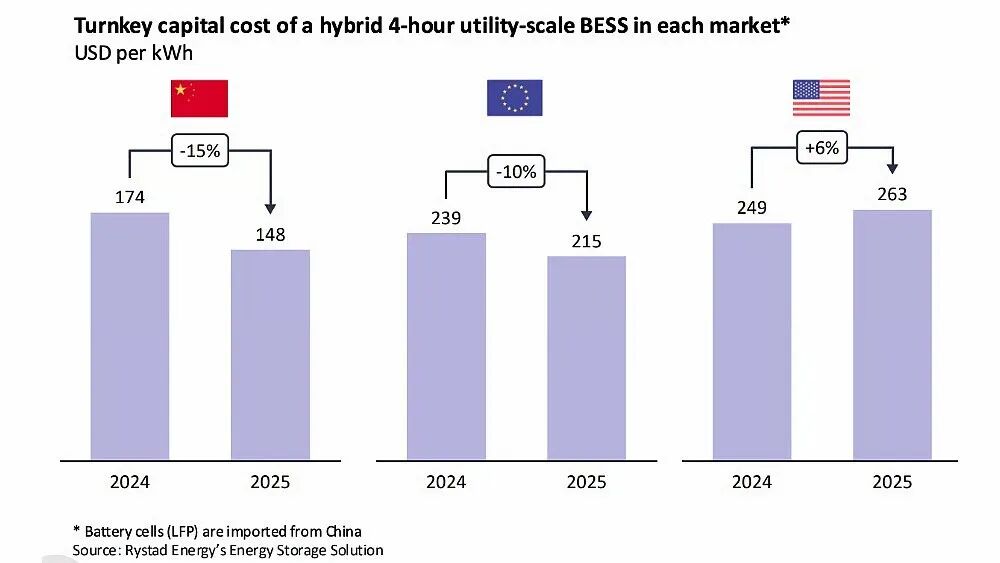 中国凭借成熟的纵向集成供应链,再次刷新全球储能成本底线。2025年中国4小时光储系统总成本降至148美元/kWh,同比下降15%。相比之下,美国受贸易壁垒和关税政策影响,储能成本不降反升,平均成本高达263美元/kWh,居全球最高水平之列。欧洲市场则紧随中国之后,平均成本同比下降10%至215美元/kWh,受益于与中国供应商的紧密联系。