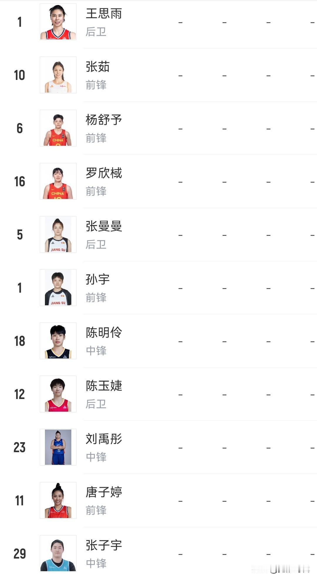 中国女篮热身赛名单 王思雨张子宇紧急归队 中锋 陈明伶 刘禹彤 张子宇 控卫 王