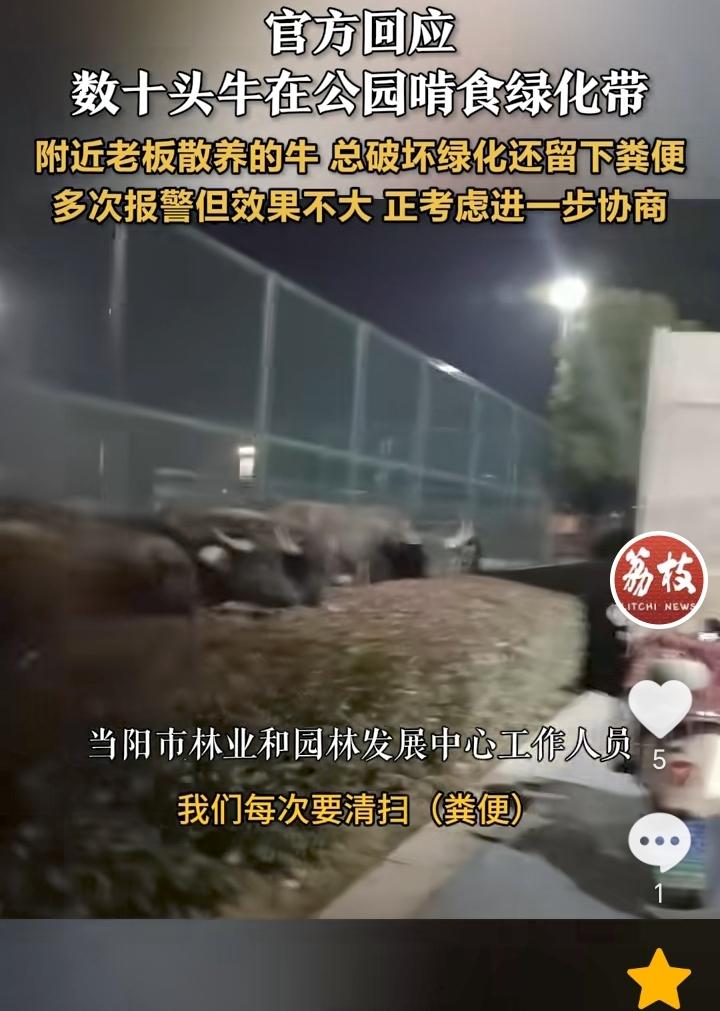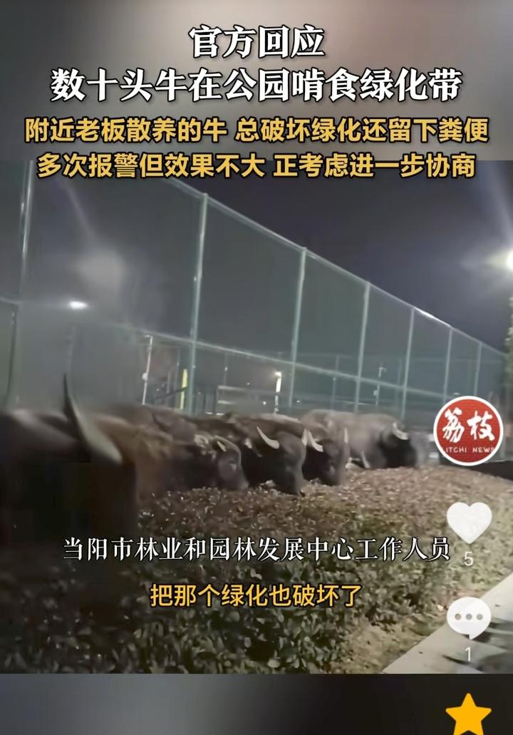 “有损阴德”!湖北宜昌,公园附近老板散养的数十头牛,老是跑出来破坏绿化带,留下粪便。公园工作人员表示,这样不仅破坏了环境,而且也增加了我们的负担,每次都要清扫粪便,每次牛来我们都使劲赶,然后给主人说效果也不是很好,目前有关部门正在协助协调,看能不能把牛圈养起来。 从牛经常去破坏绿化带,在绿化带留下粪便就可以看出牛主人的人品,既然自己牛去破坏了人家绿化带,换做有素质的人,肯定是不会让这种情况再次发生,反观这些牛主人,都被人找上门了都没有察觉事情的严重性,而且协商效果也不是很好。 做人还是要善良多积德,因为这样才会有福报,如果任由自己的牛去害人,那就是有损阴德。 养牛还是圈养起来的好,以免牛到处乱跑搞破坏,而且到处的粪便也是会严重污染了环境。