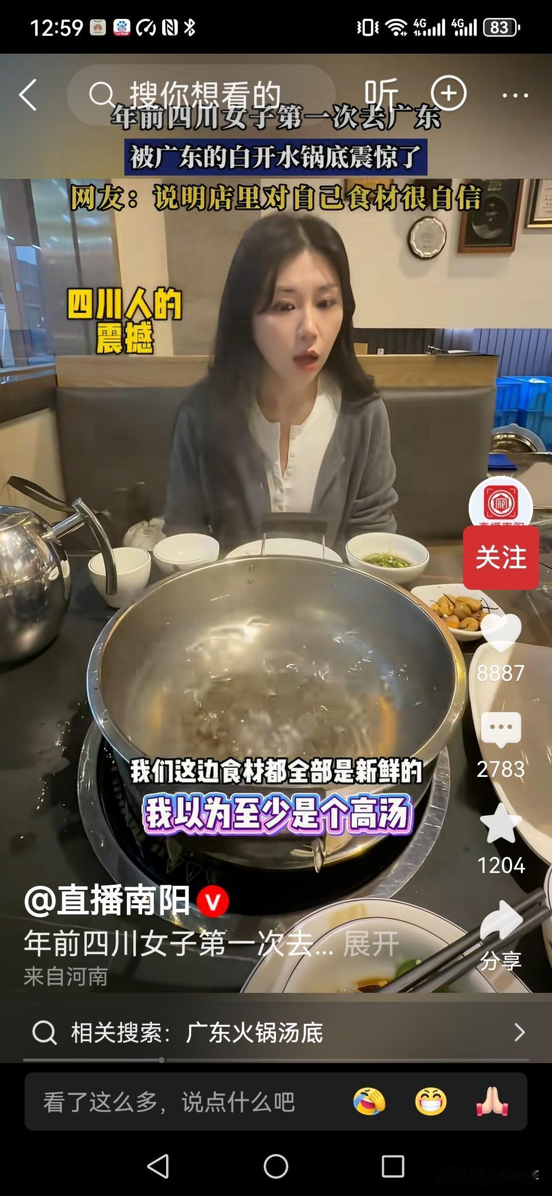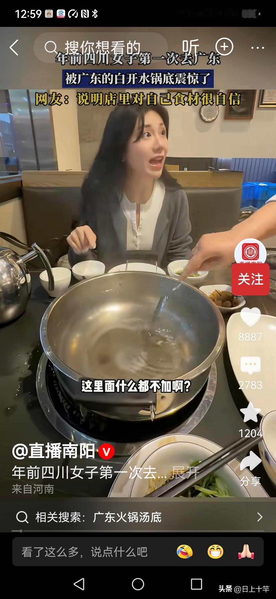 四川人到广东吃火锅被震惊了,真正的原滋原味白开水汤底! 什么都不加,没有高汤,也没有麻辣油,更没有其他任何东西! 吃的就是一个健康纯正的滋味! 都说广东人最会喝汤煲汤,做到极致可能就是返璞归真,直接喝开水即可! 我作为无锡人,饮食偏酸甜,总是被其他北方同学嘲笑吃的没味! 但是有一次我到了广州,吃到了全白糖馅料的包子,才发现,吃甜食,广州才是大佬! 欢迎大家到广东品尝美食!