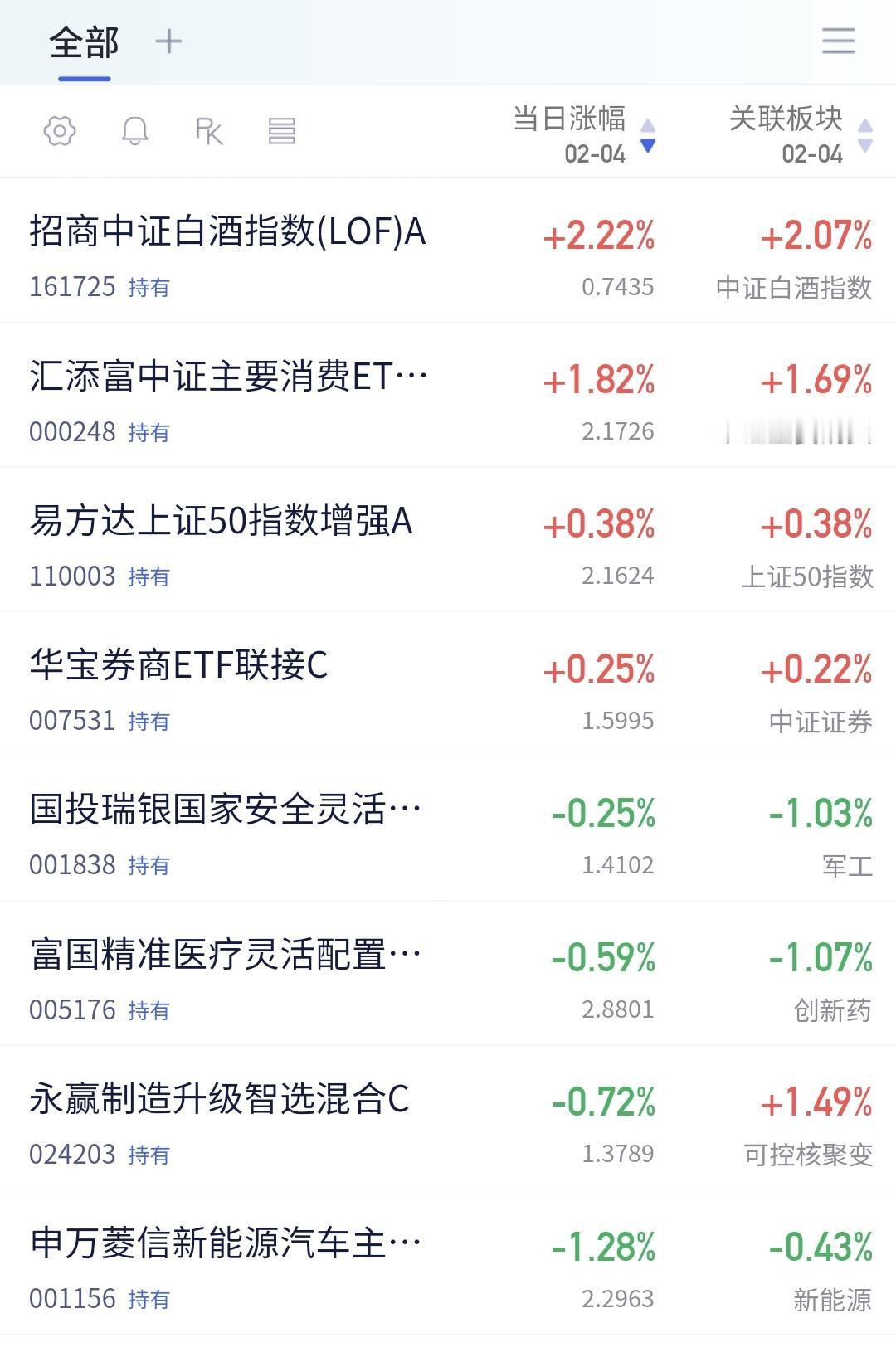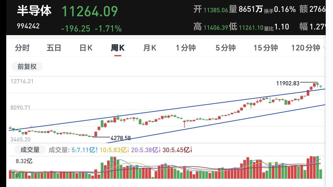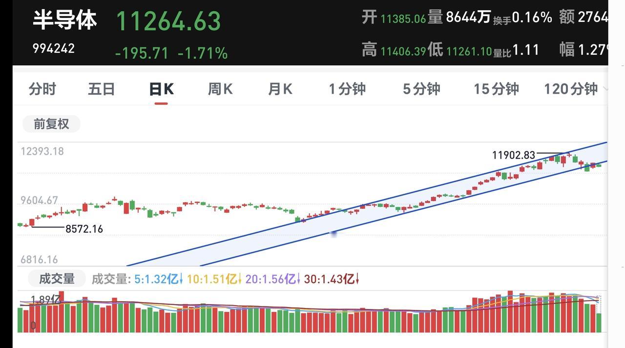 基金:半导体板块和白酒板块是什么情况 市场下午开盘以后,上证指数翻红,但走势是极度的分化,看下面的截图2,黄色线向下走的时候,蓝色线在向上走,如果黄色线不能跟随向上,这样的上涨持续性就不会强,密切注意黄色线的动态,能不能跟随蓝色线上涨。 半导体板块今天是下跌,盘中估值下跌了2.26%,这个板块的持有人数在所有板块当中排名第3位,散户人数不少,存在洗盘的需求。 看下面的截图5,这是半导体板块日K线图,前天下跌跌破上涨通道的下轨线,昨天上涨收回到上涨通道内,今天下跌又来到了上涨通道的下方,近期观察能不能重新回到上涨通道内,如果有效跌破上涨通道的下轨线,短线的人是需要注意风险的,想进场的人也需要耐心等待。 看下面的截图6,这是半导体板块周K线图,前段时间上涨突破了上涨通道的上轨线,最近是震荡回落走势,又来到了上涨通道上轨线附近,但还是处于上升趋势中。也就是说,半导体板块周线级别处于上涨趋势中,半导体板块的大方向是向上的,长线持有的人完全可以继续持有。 半导体板块日线级别处于上涨趋势,破位中短线持有的人需要注意长线持有的人可以忽略这样的波动,你首先要知道自己是长线持有者还是短线持有者,然后才能根据自己的情况确定相应的操作策略。 持有的基金中,估值上涨幅度最大的三个板块是:白酒板块,大消费板块,上证50板块,下跌幅度最大的三个板块是:AI应用板块,5G板块,先进制造板块我,估值整体亏损了1.40万元。 白酒板块现在盘中大涨,估值已经上涨了2.20%,今天上涨的幅度越大越好,今天如果真的是放量大阳线,这个板块反转的可能性就很大了,上涨需要创前几天大阳线之后的新高,今天如果能够上涨突破白酒板块周线级别下跌通道的上轨线,那就更加妙了。 花一秒钟点赞,花30秒钟评论,就是对我最大的支持,谢谢大家的支持。