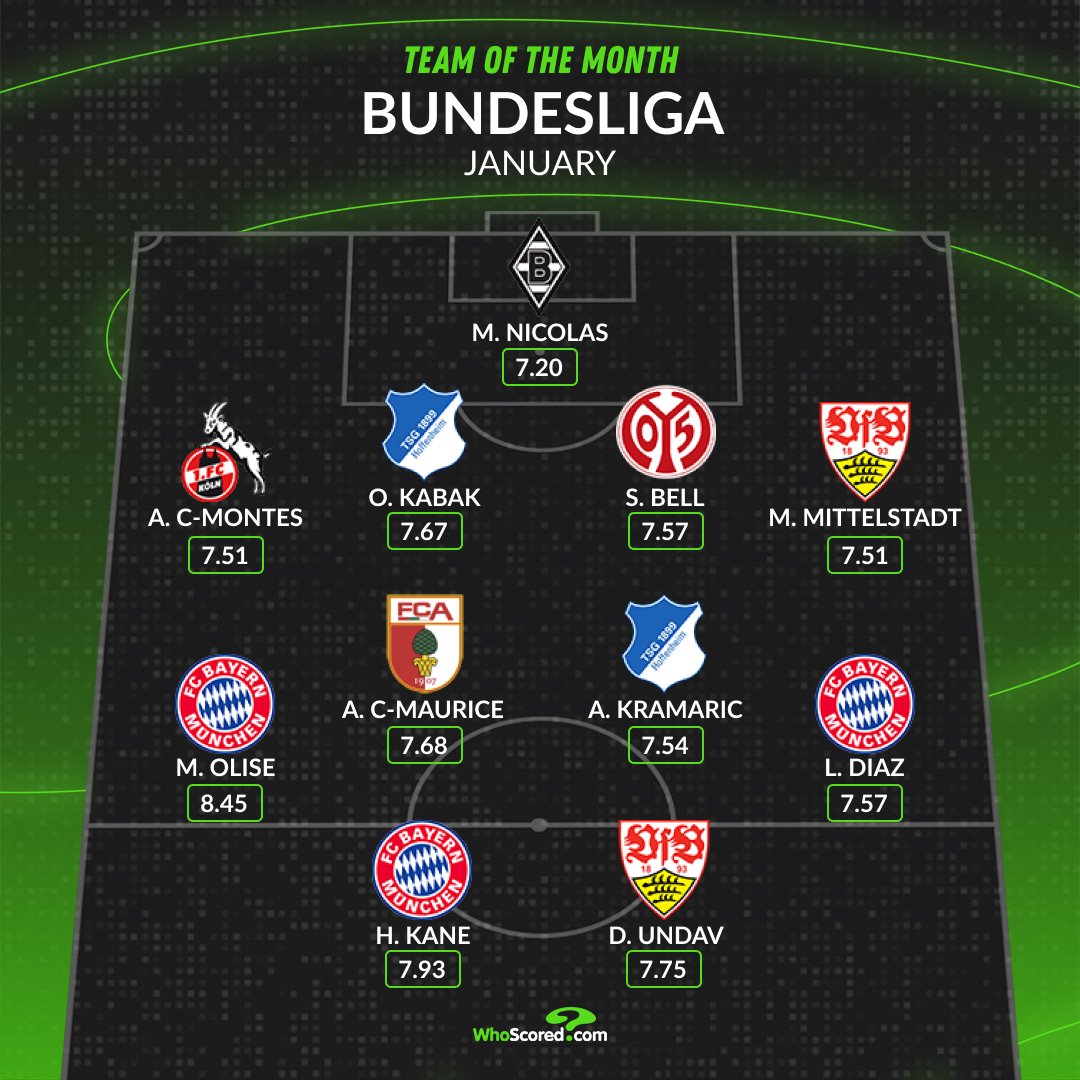 虎扑02月04日讯著名统计网站WhoScored日前公布了德甲1月最佳阵容,拜仁三叉戟凯恩、奥利塞、迪亚斯领衔,斯图加特、霍芬海姆各两人入选。