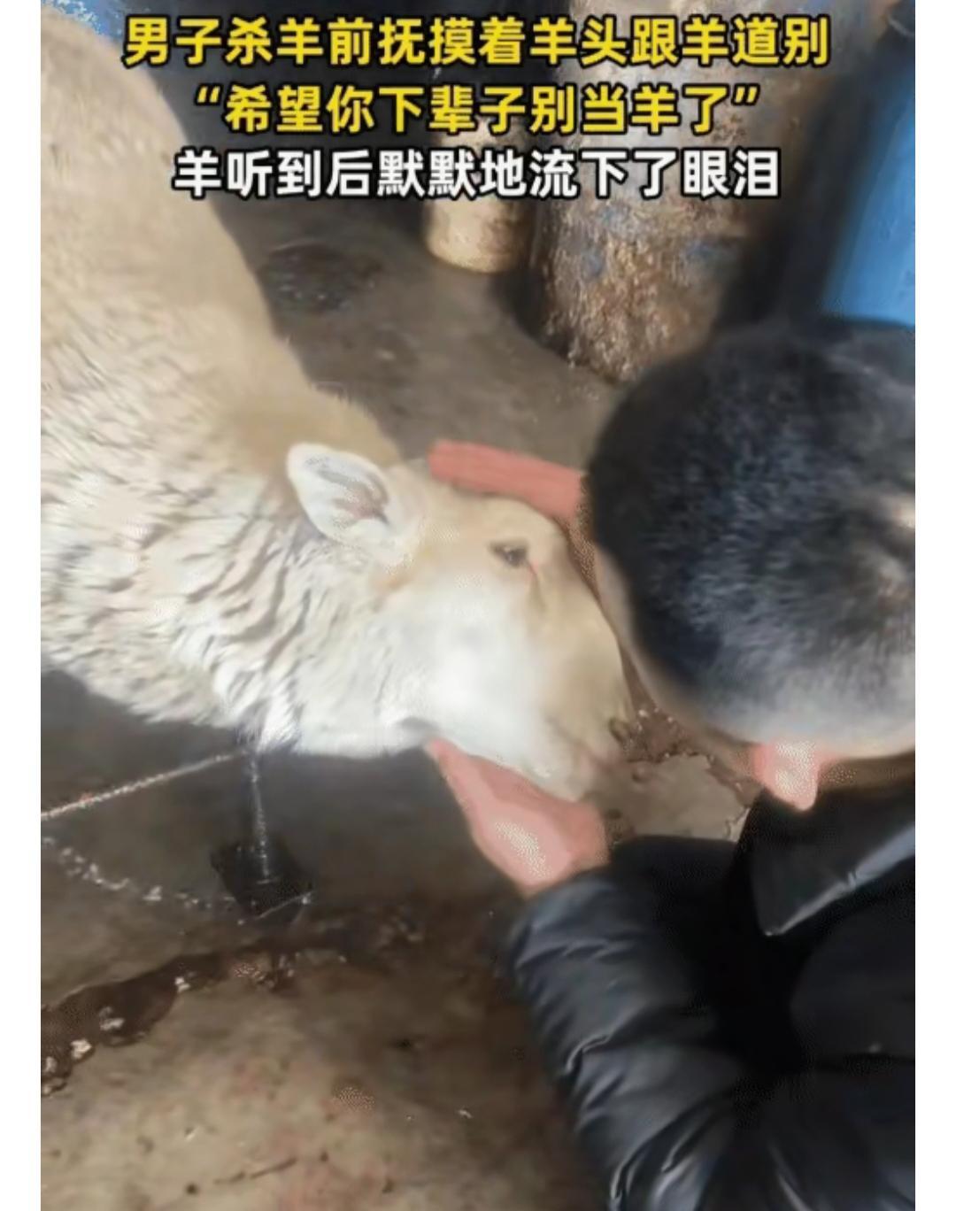 原来万物真的都有灵性! 山东一男子过年准备提前宰羊炖羊汤,没想到,当他磨好刀看到羊时,羊竟然没有挣扎,也没有发出一声叫唤,只是乖乖低着头,耳朵耷拉着,浑身透着一股说不出的落寞。看得大哥也挺于心不忍的,摸了好久羊的头,说:希望你下辈子别当羊了,不料,神奇的一幕发生了…… 这只羊好像听懂了这句话,缓缓的抬起头,大哥能清晰地看到,它的眼眶里正慢慢的顺着眼角一点点滑落泪水,流在了地上。把大哥直接都看懵了。 网友们看了也是在评论区恳求大哥不要宰它了,羊虽说是动物不会说话,但它们也会害怕,也会难过,只是没法用语言表达,只能靠着肢体和眼神传递情绪。 这只羊真的太让人动容了。其实人与动物有很多种可以和谐共处的方式,何必要杀生呢?