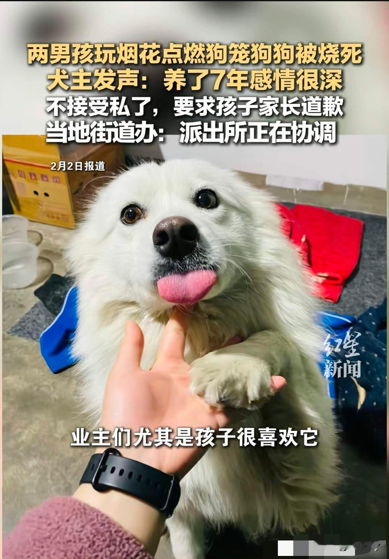连云港烧死宠物狗事件,萨摩耶主人最新回应:绝不原谅一定要为狗狗小旺讨回公道! 狗养在小区的公共区域,狗主人为什么要在那里搭建狗笼子? 为什么在小区公共区域堆放易燃物?小区公共区域是不允许养狗的!没条件最好不要养狗!这些道理成年人都是应该懂的! 至于孩子,公共场所燃放烟花造成失火,给他人的财产造成损失,应该按照财物等价赔偿! 两边都有过错,与其说两个孩子过错重,更不如说狗主人的过错更重!爱狗就应该把狗养在家里而不应该把它放在公共区域! 孩子必须批评教育普及防火知识!家长打孩子一顿也是无可厚非,让他长长记性免得日后又惹事生非! 只是可怜了那只萨摩耶,被熊熊大火活活烧死!