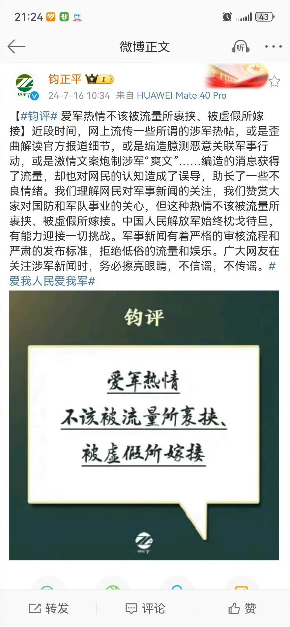 得到消息,某军事博主被禁言6个月,而这只是第一步处罚。 很多网友疑惑,为啥一个禁言要搞成“分步走”。其实这种处置方式绝非平台随意操作,而是贴合网络涉军生态治理的规范流程,背后更有明确的法规支撑。近期军地多部门一直在推进涉军自媒体专项整治,这个博主的处罚只是其中一个缩影,后续大概率还会有进一步处置动作。 先理清核心问题,这个博主被处罚绝不会是“莫名躺枪”。结合近期官方通报的同类案例,涉军博主被处置的违规行为主要集中在几类。要么是违规发布涉军敏感信息,比如炒作高新武器装备的研制试验细节、泄露性能参数;要么是臆测散布军事政策制度,用“内幕爆料”博眼球。还有些博主会编造军事谣言,甚至歪曲解读军史、抹黑军人形象,这些行为都踩了明确的红线。 可能有人觉得“发几条军事内容而已,至于这么严格”。这种想法完全忽略了军事信息的特殊性。军事信息直接关联国家安全和军队利益,哪怕是看似不起眼的细节,一旦被恶意解读或泄露,都可能造成难以挽回的损失。比如有博主曾发布部队家属院视频,标注定位还曝光训练设备,这种行为看似日常,实则已经泄露了军事敏感信息。 此次处罚的核心依据,是2025年3月1日正式施行的《互联网军事信息传播管理办法》。这个办法由多部门联合印发,对军事账号的开办、信息传播有明确要求。办法明确规定,军事账号需要经过严格核验,运营者得具备相应的政治素养、军事专业素养和保密素养,不是随便注册个账号就能发军事内容的。 监管部门对涉军自媒体的整治,从来都是“从严从细”。今年以来,北京市网信办牵头开展专项行动,仅属地网站就累计清理拦截违规涉军信息14.9万条,依法处置账号565个。这些数据足以说明,涉军网络生态治理不是“一阵风”,而是常态化推进的工作。 再说说“第一步处罚”的深层含义。6个月禁言更像是一次严厉警示,既敲打违规博主,也提醒所有涉军内容创作者守住底线。紧接着,平台和监管部门会进一步核查该博主的全部内容,若发现存在更严重的违规行为,比如长期编造军事谣言、恶意抹黑军队形象,后续大概率会升级处罚,直接封禁账号。情节特别严重的,还可能被追究法律责任。 当下不少军事博主陷入了“流量误区”,为了涨粉变现,刻意炒作敏感话题、编造虚假内幕,甚至用低俗恶搞的方式消费拥军情怀。比如有些博主冒充官方军事账号,蹭炒军事热点吸粉;还有些博主发布付费内容,虚假解读装备细节和战术战法,这些行为都在触碰监管红线。 其实军事内容传播,核心是传递正确信息、弘扬正能量,而不是博眼球赚流量。办法鼓励创作者发布宣传强军思想、反映国防和军队建设成就、传播国防教育知识的内容,这些才是涉军自媒体该做的事。退役军人开办账号也有明确限制,不能使用原单位名称、曾经担任的军队职务等信息,避免误导公众。 此次处罚事件,也是给整个涉军自媒体行业敲了警钟。不是所有话题都能拿来炒作,不是所有内容都能随意发布。军事领域的特殊性,决定了其传播过程必须守住安全保密的底线,尊重历史和军队形象。 网友们也要擦亮眼睛,辨别涉军信息的真伪。遇到编造的军事谣言、恶意抹黑军队的内容,要主动举报,共同维护清朗的涉军网络环境。不要被流量裹挟,跟风传播不实信息,无意间成为违规行为的“帮凶”。 后续,军地相关部门还会持续曝光典型违规案例,加大处置力度。对涉军自媒体来说,唯有坚守法规底线、深耕优质内容,才能长久运营。那些抱着侥幸心理触碰红线的账号,迟早会被监管盯上,最终难逃处罚。这既是对国家安全负责,也是对军队和军人的尊重,更是网络生态健康发展的必然要求。