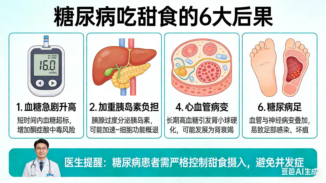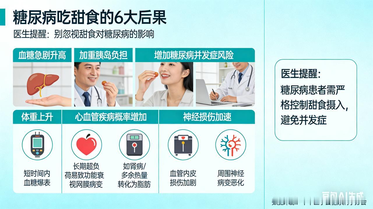 糖尿病吃甜食的 6 大后果,医生提醒别忽视 在大众的普遍认知里,“糖尿病一点甜食都不能碰”仿佛是一条不可逾越的铁律,众多糖尿病患者对此深信不疑,视甜食为洪水猛兽,避之不及。然而,医学专家却指出,这种观念过于绝对和片面。糖尿病患者并非完全与甜食绝缘,但若毫无节制地摄入甜食,将会引发一系列严重且复杂的健康后果。 甜食中富含的精制糖,如白砂糖、葡萄糖等,具有极高的血糖生成指数(GI)。这些糖分在进入人体后,能够被迅速吸收进入血液循环,导致血糖水平在短时间内急剧上升。对于糖尿病患者而言,由于其胰岛β细胞功能受损,胰岛素分泌不足或存在胰岛素抵抗,身体无法及时有效地将血糖转运至细胞内进行利用或储存,从而使得血糖居高不下。 血糖的急剧升高会打破体内的代谢平衡,引发一系列急性并发症。例如,糖尿病酮症酸中毒,这是由于体内胰岛素严重缺乏,导致脂肪分解加速,产生大量酮体,当酮体在体内积聚过多时,就会引起酸中毒,患者会出现恶心、呕吐、呼吸深快、脱水等症状,严重时甚至会危及生命。高渗高血糖综合征也是一种严重的急性并发症,主要表现为高血糖、高渗状态和脱水,患者常伴有意识障碍,病死率较高。 多数甜食不仅含有大量的糖分,还富含脂肪,属于高热量食物。长期过量食用甜食,会使患者摄入的热量远远超过身体消耗的热量,多余的热量会在体内转化为脂肪储存起来,导致体重不断增加。肥胖是糖尿病的重要危险因素之一,它会进一步加重胰岛素抵抗,使身体对胰岛素的敏感性降低。 胰岛素抵抗的加重会导致血糖控制更加困难,患者需要使用更大剂量的降糖药物或胰岛素来控制血糖。而药物的副作用以及血糖的波动又会影响患者的食欲和代谢功能,形成一个恶性循环。此外,肥胖还会增加患者患心血管疾病、高血压、高血脂等其他代谢性疾病的风险,严重影响患者的身体健康和生活质量。 食用甜食会刺激胰岛β细胞分泌胰岛素。对于糖尿病患者来说,长期大量摄入甜食,会使胰岛β细胞长期处于高负荷的工作状态,就像一台长期超负荷运转的机器,其功能会逐渐衰退。随着胰岛功能的不断衰竭,患者对胰岛素的需求量会不断增加,需要不断调整降糖治疗方案,增加药物剂量或注射次数。 这不仅会给患者带来身体上的痛苦和经济上的负担,还会增加治疗的风险。例如,使用大剂量胰岛素可能会导致低血糖的发生,低血糖会对患者的脑组织造成损害,严重时甚至会导致昏迷、死亡。而且,胰岛功能的衰竭也意味着患者的病情逐渐加重,治疗难度大幅升级,预后也会变差。 甜食残渣容易在口腔内残留,为细菌的生长繁殖提供了良好的条件。糖尿病患者由于血糖较高,口腔内的唾液糖分也相应增加,这进一步促进了细菌的滋生。同时,糖尿病患者的免疫力较低,口腔黏膜的防御功能减弱,更容易受到细菌的侵袭,从而引发各种口腔疾病。 常见的口腔疾病包括龋齿、牙龈炎、牙周炎等。龋齿会导致牙齿疼痛、敏感,影响患者的进食和咀嚼功能;牙龈炎和牙周炎会引起牙龈出血、肿胀、疼痛,严重时还会导致牙齿松动、脱落。这些口腔问题不仅会影响患者的口腔健康,还会降低患者的生活质量,使患者在社交、饮食等方面受到诸多限制。 心血管负担加重,心脑血管疾病风险飙升 长期高血糖会损伤血管内皮细胞,使血管壁的通透性增加,血液中的脂质成分更容易沉积在血管壁上,形成动脉粥样硬化斑块。而过量摄入甜食导致的高血脂、高血糖协同作用,会加速动脉粥样硬化的进程,使血管变得狭窄、僵硬,弹性下降。 动脉粥样硬化是心脑血管疾病的重要病理基础,它会增加患者患冠心病、心肌梗死、脑卒中等心脑血管疾病的风险。这些疾病具有发病率高、致残率高、致死率高的特点,一旦发作,往往会给患者和家庭带来沉重的打击。例如,心肌梗死会导致心肌细胞坏死,影响心脏的功能,严重时会引起心力衰竭;脑卒中会导致脑组织损伤,引起偏瘫、失语、认知障碍等后遗症,严重影响患者的生活自理能力 过量摄入甜食还可能引发一系列其他健康问题。例如,过多的糖分会在肝脏中转化为脂肪堆积起来,形成脂肪肝。脂肪肝会影响肝脏的正常功能,导致肝脏代谢紊乱,进一步加重糖尿病患者的代谢负担。同时,甜食中的果糖会促进尿酸的合成,抑制尿酸的排泄,导致血尿酸水平升高,增加痛风发作的风险。 痛风是一种由于尿酸盐沉积在关节和周围组织而引起的疾病,患者常出现关节疼痛、红肿、发热等症状,严重影响关节的功能和活动能力。此外,长期高糖饮食还可能与某些癌症的发生发展有关,虽然目前具体的机制尚不完全清楚,但已经引起了许多学者的关注。 糖尿病患者并非与甜食彻底绝缘,但一定要在医生或营养师的严格指导下,科学合理地选择甜食。可以选择一些低升糖指数的甜食,如用代糖制作的糕点、水果中的草莓、柚子等,并严格控制摄入量。同时,要密切监测血糖变化,根据血糖情况及时调整饮食和治疗方案。只有这样,才能在享受美味的同时,有效控制病情,守护好身体健康。