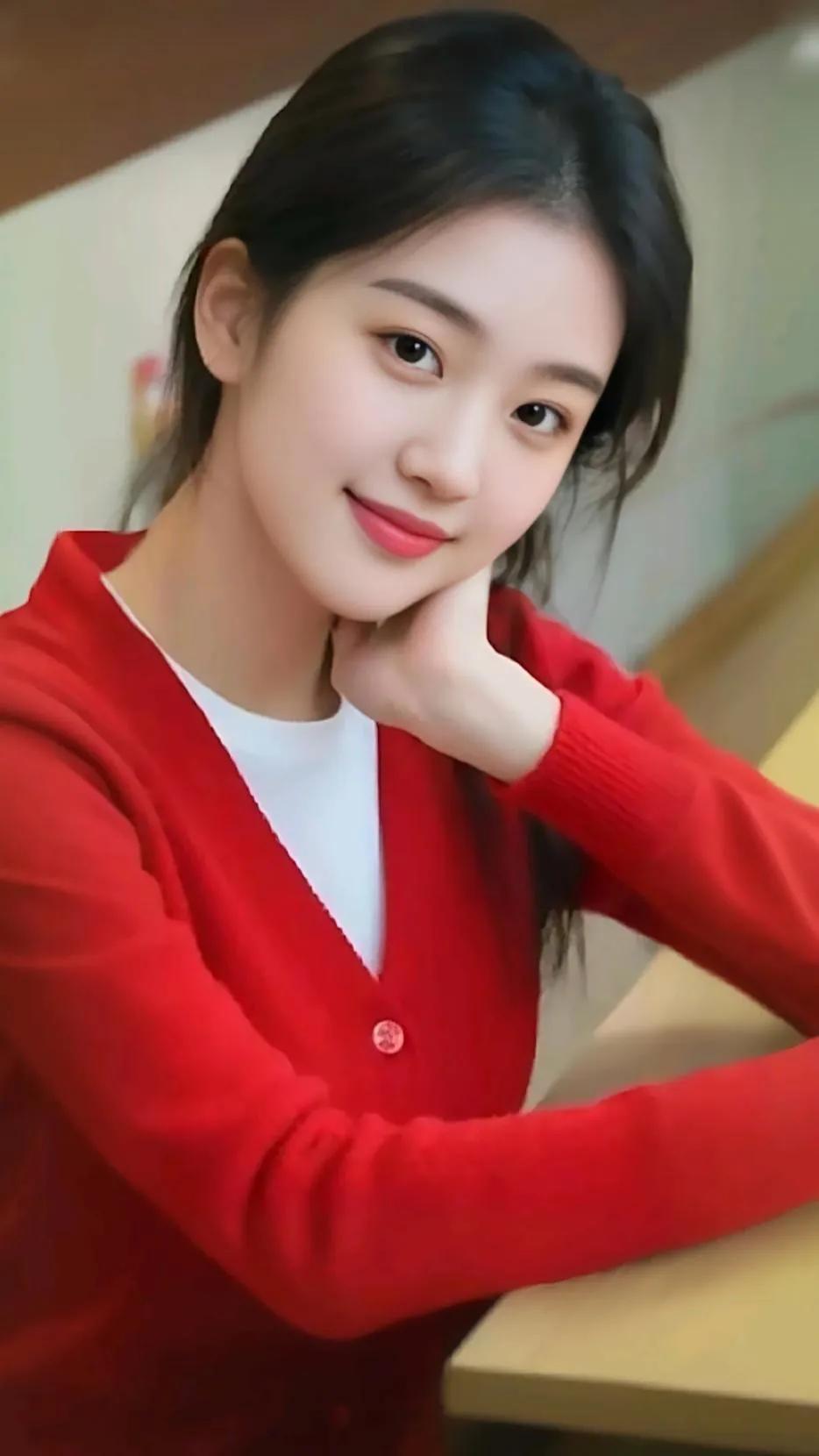 优雅红衣少女,珍珠项链点缀,微笑中散发迷人魅力。