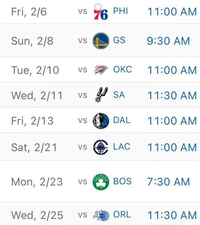 湖人将迎来连续8个主场,战绩会是? 作一下简单预测: 2月6日 周五 11:00:vs 费城76人,湖人胜,乔治被禁赛,实力较弱! 2月8日 周日 09:30:vs 金州勇士,湖人胜,库里受伤,格林,波杰等人,陷入交易流言! 2月10日 周二 11:00:vs 俄克拉荷马城雷霆,雷霆胜,雷霆势头迅猛,湖人习惯连赢几场后输球! 2月11日 周三 11:30:vs 圣安东尼奥马刺,湖人胜,输球后,触底反弹! 2月13日 周五 11:00:vs 达拉斯独行侠,湖人胜,独行侠实力太弱,不值一提! 2月21日 周六 11:00:vs 洛杉矶快船(洛城德比),湖人胜,快船刚刚完成大交易,哈登去了骑士,实力大不如前! 2月23日 周一 07:30:vs 波士顿凯尔特人,湖人胜,黄绿大战,湖人必须拿下,报上次惨败之仇! 2月25日 周三 11:30:vs 奥兰多魔术,湖人胜,不知道为什么,就是感觉! 湖人 nba 湖人 湖人赛程