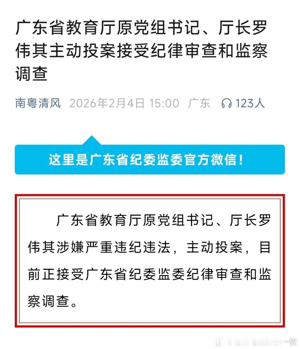 广东省教育厅原党组书记、厅长罗伟其主动投案接受纪律审查和监察调查。