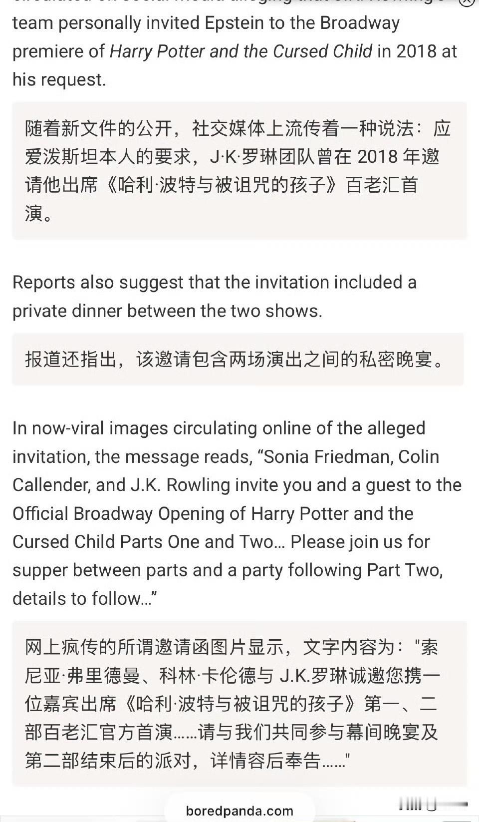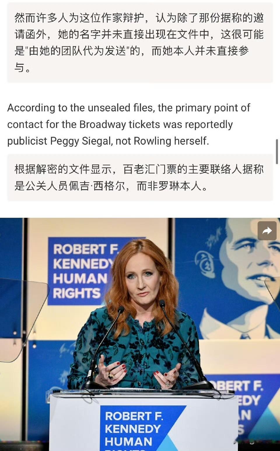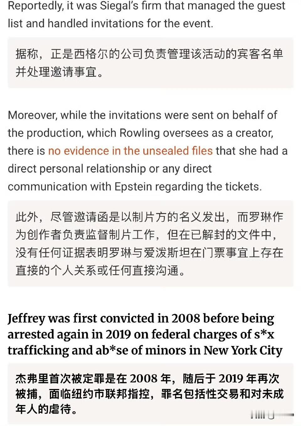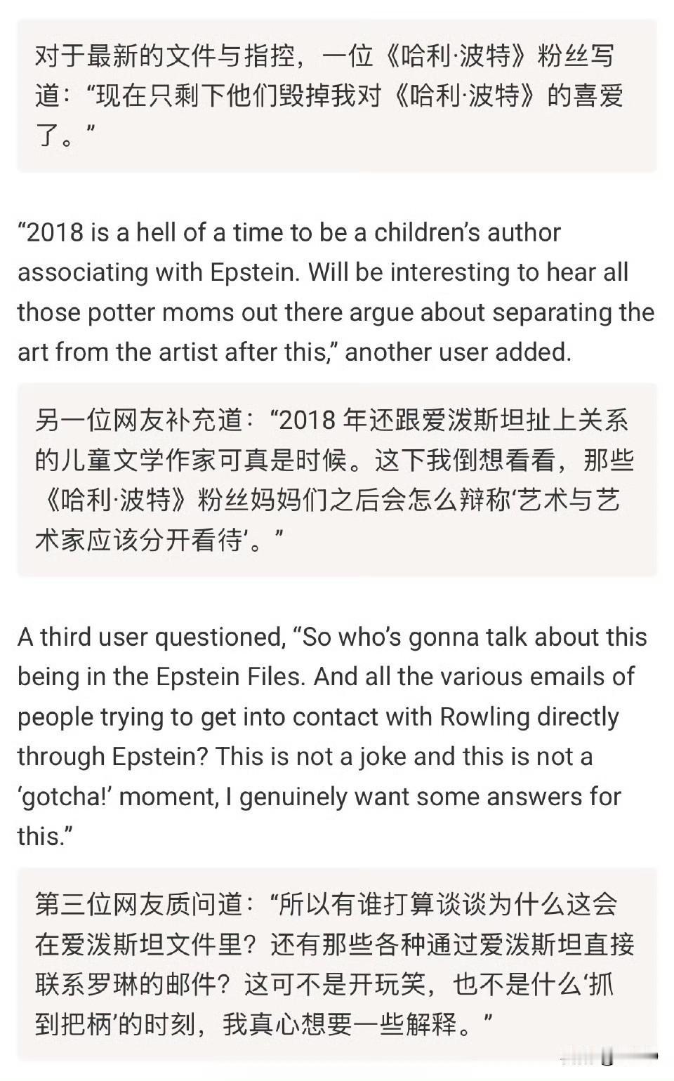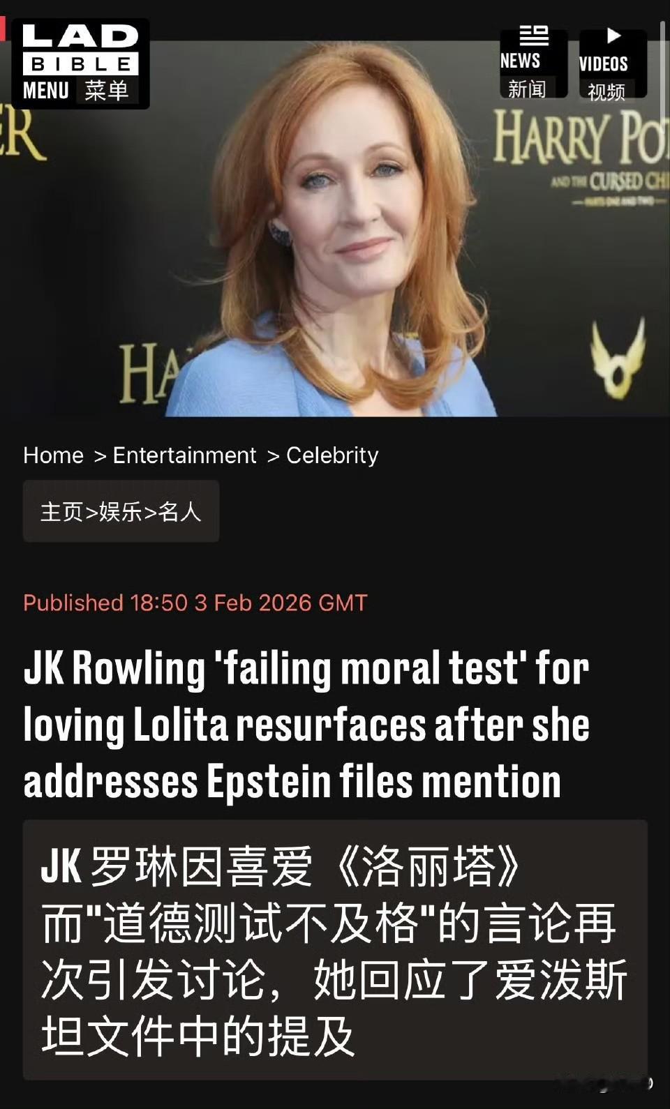 在爱泼斯坦文件(主要是电子邮件和邀请函记录)中,有美国媒体发现了J.K. 罗琳的名字被提及,主要出现在2018年的一份百老汇演出邀请函上: “索尼亚·弗里德曼、科林·卡伦德与 J.K.罗琳诚邀您携一位嘉宾出席《哈利·波特与被诅咒的孩子》第一、二部官方百老汇首演仪式。”(日期为 2018 年 4 月 22 日)。 这份邀请是针对爱泼斯坦的,附带晚餐和演出票的安排。当时爱泼斯坦已经因2008年性犯罪定罪(涉及未成年少女)10年之久。 另外有一些邮件显示,有人(身份被涂黑)曾向爱泼斯坦请求介绍认识J.K. 罗琳,暗示爱泼斯坦“认识上流社会人士”,可能帮得上忙。 这些文件导致网上出现指控,认为罗琳或她的团队“邀请”了爱泼斯坦,特别是在她近年来强烈强调“保护女性和女孩”的立场下,被一些人视为讽刺或虚伪。 J.K. 罗琳发帖否认了这个说法:“这简直荒谬至极。无论是我也好,还是我团队的任何人,都未曾与杰弗里·爱泼斯坦见过面、交流过,或邀请他参加任何活动。”也有媒体解释说这是一份模板化的公关邮件,票务通过公关人物Peggy Siegal联系制作人Colin Callender处理,并非罗琳个人或团队直接邀请爱泼斯坦。罗琳方面则强调从未见过、联系过或私人邀请过爱泼斯坦。 此前,调查人员曾表示,许多名字出现在爱泼斯坦的日志和电子邮件中,这属于其广泛的职业与人际网络的一部分,被提及在爱泼斯坦文件中并不构成犯罪的证据。尽管罗琳已公开否认她或她的团队与爱泼斯坦有任何接触,这并未阻止社交媒体上的“侦探们”深挖她所有类似主题的声明。比如,这导致粉丝们重新审视罗琳关于小说《洛丽塔》的评论。《洛丽塔》堪称有史以来最具争议的作品之一。这部 1955 年问世的小说聚焦主人公对 12 岁少女的痴迷,最终演变为绑架与侵害的悲剧。罗琳在 2000 年接受 BBC 广播 4 台采访时曾为这本书辩护,表示每次读完都会让她落泪。她称这本书的“情节本可能沦为最廉价的情色描写,却通过作者弗拉基米尔·纳博科夫的笔触,化作一部伟大而凄美的爱情故事。”2024 年这些言论首次被重新翻出,一则疯传的帖子指出她并未理解这部作品,并质疑她为何会觉得这个故事“浪漫”。另一条热门推文暗示,《洛丽塔》是一道“道德测试”,而她认为这部小说浪漫便表明她“未能通过考验”。由于她被媒体联系到爱泼斯坦文件中,这一说法再次浮出水面。这几天有人发推称:“还记得 JK·罗琳曾将《洛丽塔》称作悲剧爱情故事吗?”有趣的是,将这部小说改编成著名争议电影的斯坦利·库布里克,也曾称其为“一段非常悲伤而温柔的爱情故事”。库布里克拍了《大开眼界》,展现了一种欲望与恐惧交织的、近乎催眠的美国原始邪恶,这是库布里克的最后一部电影,他在展示给华纳兄弟他的最后剪辑版的四天后去世。在牢a话题出圈和爱泼斯坦新文件大规模披露后,很多网友对《大开眼界》这部电影也有了一种新的认识。媒体报道来自imdb、fandomwire、BoredPanda,爱泼斯坦文件来自美国司法部