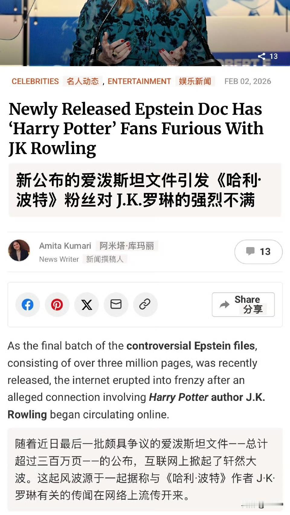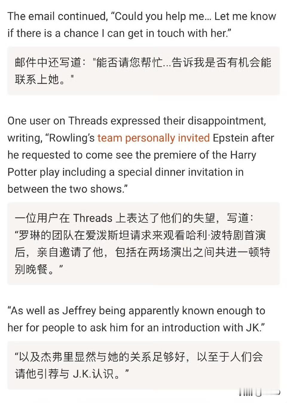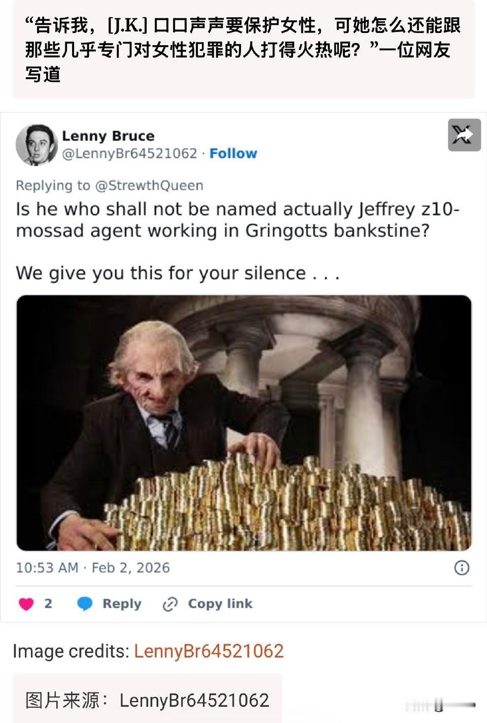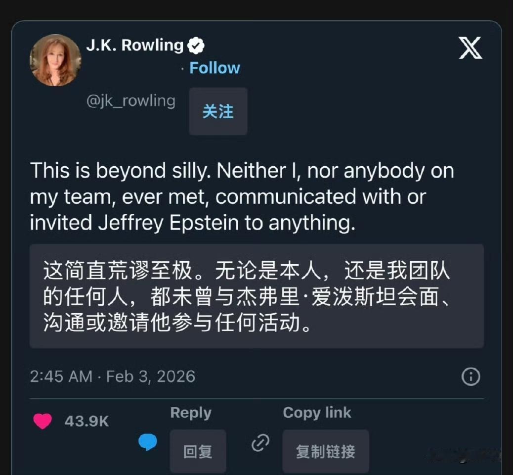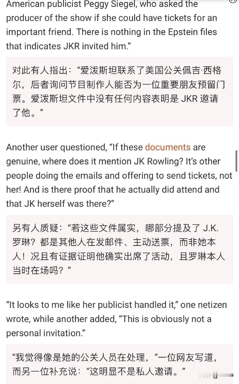 在爱泼斯坦文件(主要是电子邮件和邀请函记录)中,有美国媒体发现了J.K. 罗琳的名字被提及,主要出现在2018年的一份百老汇演出邀请函上: “索尼亚·弗里德曼、科林·卡伦德与 J.K.罗琳诚邀您携一位嘉宾出席《哈利·波特与被诅咒的孩子》第一、二部官方百老汇首演仪式。”(日期为 2018 年 4 月 22 日)。 这份邀请是针对爱泼斯坦的,附带晚餐和演出票的安排。当时爱泼斯坦已经因2008年性犯罪定罪(涉及未成年少女)10年之久。 另外有一些邮件显示,有人(身份被涂黑)曾向爱泼斯坦请求介绍认识J.K. 罗琳,暗示爱泼斯坦“认识上流社会人士”,可能帮得上忙。 这些文件导致网上出现指控,认为罗琳或她的团队“邀请”了爱泼斯坦,特别是在她近年来强烈强调“保护女性和女孩”的立场下,被一些人视为讽刺或虚伪。 J.K. 罗琳发帖否认了这个说法:“这简直荒谬至极。无论是我也好,还是我团队的任何人,都未曾与杰弗里·爱泼斯坦见过面、交流过,或邀请他参加任何活动。”也有媒体解释说这是一份模板化的公关邮件,票务通过公关人物Peggy Siegal联系制作人Colin Callender处理,并非罗琳个人或团队直接邀请爱泼斯坦。罗琳方面则强调从未见过、联系过或私人邀请过爱泼斯坦。 此前,调查人员曾表示,许多名字出现在爱泼斯坦的日志和电子邮件中,这属于其广泛的职业与人际网络的一部分,被提及在爱泼斯坦文件中并不构成犯罪的证据。尽管罗琳已公开否认她或她的团队与爱泼斯坦有任何接触,这并未阻止社交媒体上的“侦探们”深挖她所有类似主题的声明。比如,这导致粉丝们重新审视罗琳关于小说《洛丽塔》的评论。《洛丽塔》堪称有史以来最具争议的作品之一。这部 1955 年问世的小说聚焦主人公对 12 岁少女的痴迷,最终演变为绑架与侵害的悲剧。罗琳在 2000 年接受 BBC 广播 4 台采访时曾为这本书辩护,表示每次读完都会让她落泪。她称这本书的“情节本可能沦为最廉价的情色描写,却通过作者弗拉基米尔·纳博科夫的笔触,化作一部伟大而凄美的爱情故事。”2024 年这些言论首次被重新翻出,一则疯传的帖子指出她并未理解这部作品,并质疑她为何会觉得这个故事“浪漫”。另一条热门推文暗示,《洛丽塔》是一道“道德测试”,而她认为这部小说浪漫便表明她“未能通过考验”。由于她被媒体联系到爱泼斯坦文件中,这一说法再次浮出水面。这几天有人发推称:“还记得 JK·罗琳曾将《洛丽塔》称作悲剧爱情故事吗?”有趣的是,将这部小说改编成著名争议电影的斯坦利·库布里克,也曾称其为“一段非常悲伤而温柔的爱情故事”。库布里克拍了《大开眼界》,展现了一种欲望与恐惧交织的、近乎催眠的美国原始邪恶,这是库布里克的最后一部电影,他在展示给华纳兄弟他的最后剪辑版的四天后去世。在牢a话题出圈和爱泼斯坦新文件大规模披露后,很多网友对《大开眼界》这部电影也有了一种新的认识。媒体报道来自imdb、fandomwire、BoredPanda,爱泼斯坦文件来自美国司法部