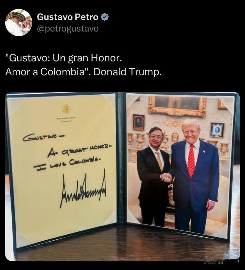 特朗普与哥伦比亚总统佩德罗的会面已经结束。特朗普对佩德罗说:“无比荣幸……我爱哥伦比亚”——这话是佩德罗自己发在官方账号上的。