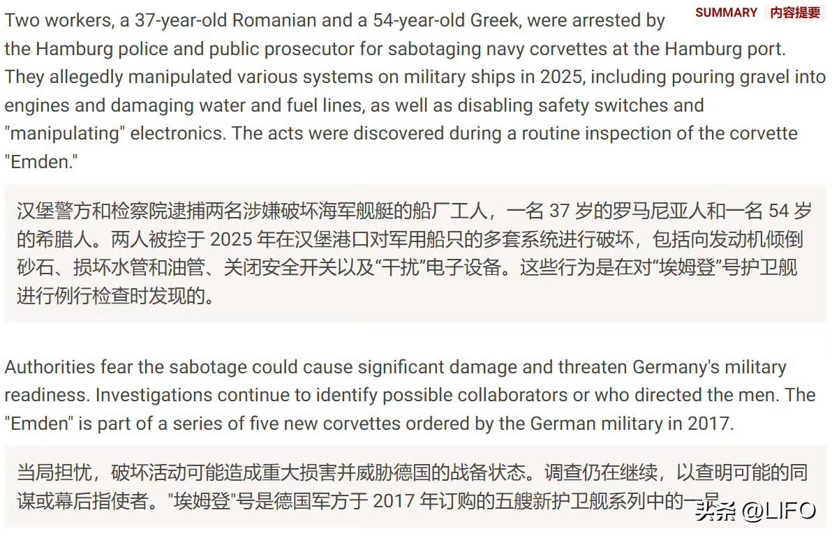 德国汉堡总检察院宣布,因涉嫌企图破坏一艘为德国海军建造的舰艇,已对两名男子执行逮捕令。两人分别在德国汉堡和希腊落网。据称,嫌疑人分别为一名 37 岁的罗马尼亚籍男子和一名 54 岁的希腊籍男子。据检方通报,这两名嫌疑人去年在汉堡港工作期间,曾对停泊于造船厂、专供德国联邦海军使用的多艘布伦瑞克级轻型护卫舰实施了破坏行为。通报指出,两人或单独、或共同作案,向其中一艘舰艇的发动机舱内灌入超过 20 公斤的喷砂用石英砂,刺穿淡水供水管道,拆卸燃料箱的加油口盖,并关闭舰上电子设备的安全断路开关。德国这么拉?