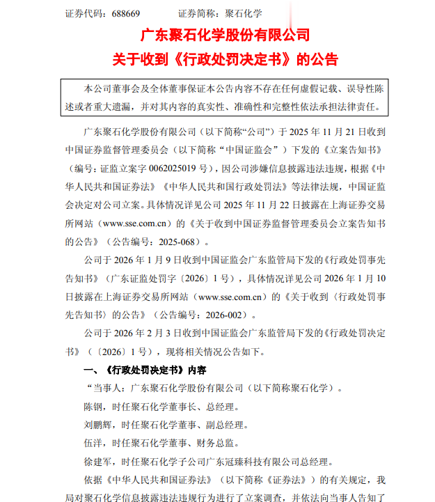 2月3日,广东聚石化学股份有限公司(688669.SH)公告,公司因收入核算不准确、关联交易披露遗漏及内控治理不规范等违规行为被中国证监会广东监管局采取行政监管措施。公司原子公司广东冠臻科技有限公司涉及空转贸易业务,存在虚假贸易情况,且关联方广州楷石医药有限公司的交易未予披露。