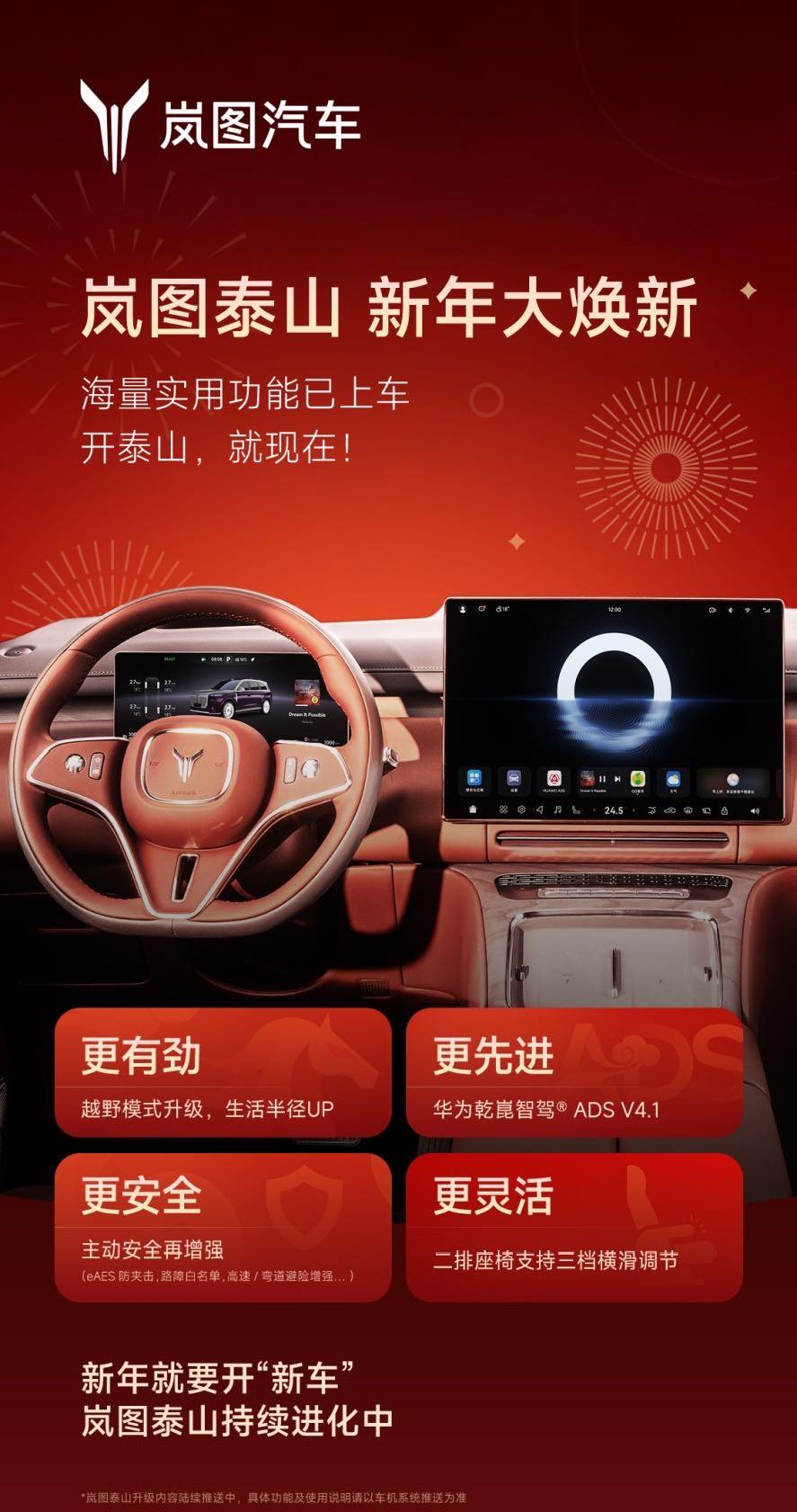 2026年2月4日,岚图汽车向岚图泰山车主正式推送首次重大OTA升级。此次升级的