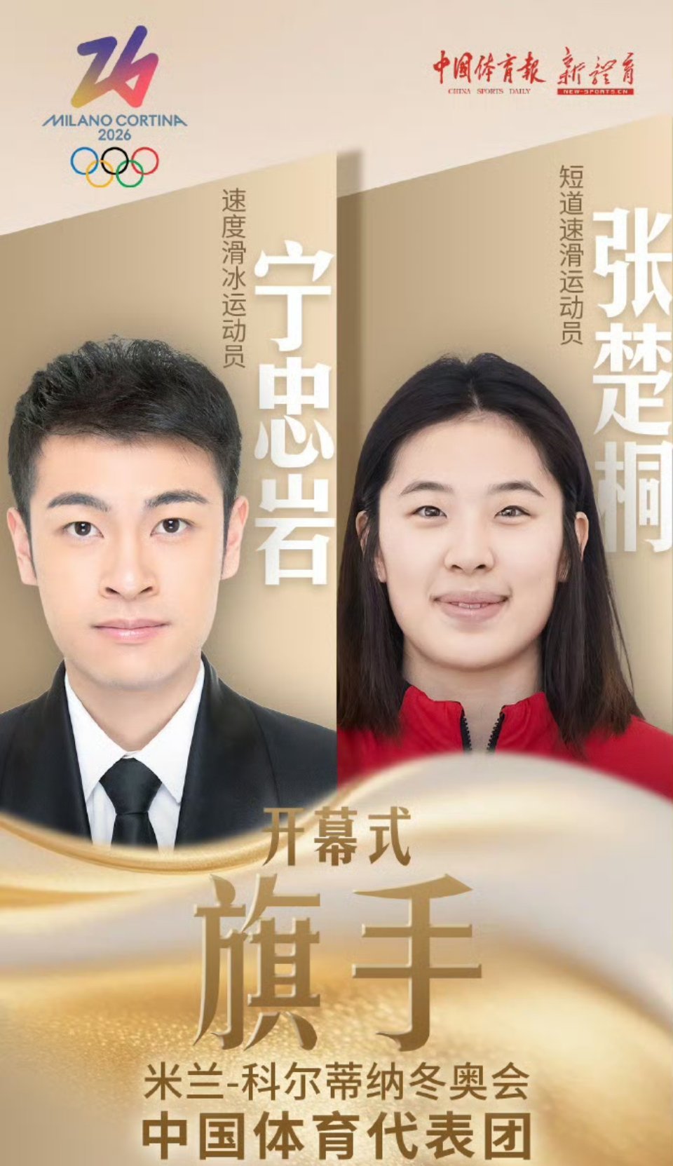 宁忠岩张楚桐中国代表团旗手官宣!宁忠岩与张楚桐携手担任米兰冬奥会中国代表团旗手,一速滑一短道,双雄并肩引领中国军团出征🇨🇳!宁忠岩是速滑中距离领军者,亚冬会三金王、世界杯屡登领奖台,本赛季1500米总成绩第三,剑指冬奥领奖台;03后张楚桐是短道新生代中坚,北京冬奥接力摘铜、亚冬会接力登顶,世界杯混合接力夺冠,经验与冲劲兼备。2月6日米兰开幕式,期待两人高举五星红旗,尽显中国速度与青春锋芒!短道混合接力、速滑宁忠岩1000/1500米皆是冲金点,为双旗手打call,祝中国冬奥军团马到成功,再创辉煌!