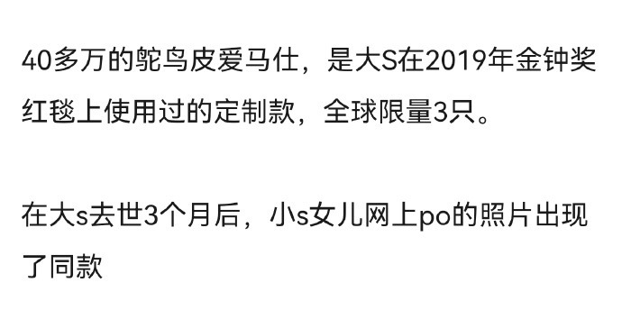大S最贵的那只40+w的包,现在疑似被人拍到在小S女儿手上。大S温泉泡汤成病情恶