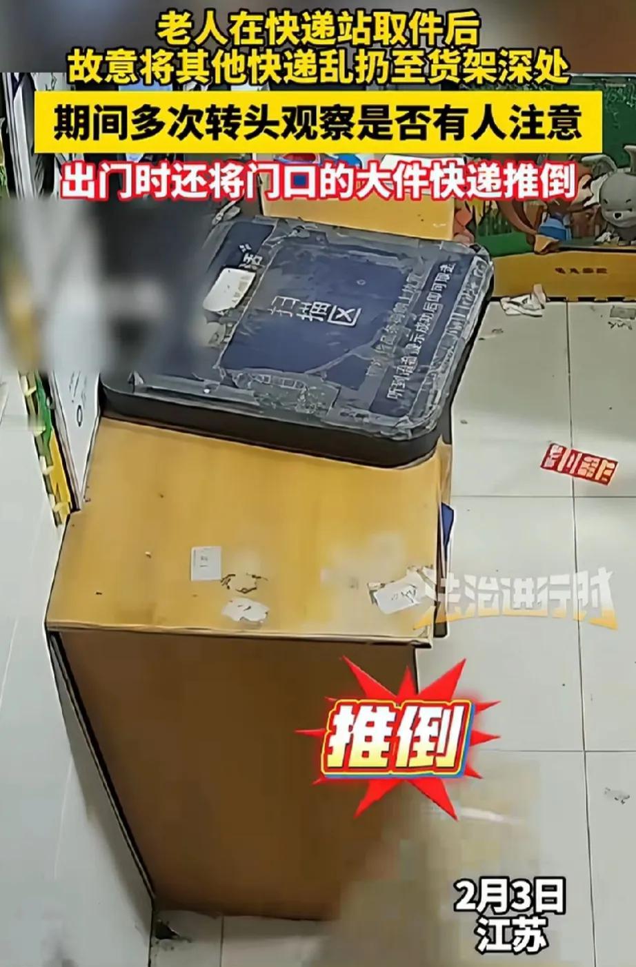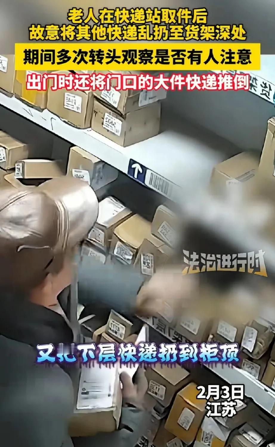 “这大爷火了”江苏,大爷去领快递时,趁人不注意,先是把别人的快递扔到角落,之后又把另一份快递扔到柜顶,最后离开快递站时又偷偷把立在门口的大件快递推倒,大爷以为神不知鬼不觉,没想到监控拍的一清二楚。网友:天生的坏种。 监控画面显示,一大爷在取快递时,偷偷使坏,他以为自己做得神不知鬼不觉,没想到,监控将他的丑事拍得一清二楚,直接让他火出圈。 只见菜鸟驿站里各种快递按货架的编号分好摆放得整整齐齐,小件、大件分开放,快递单都朝外露着,方便人家看码取件。 一个看起来6、70岁左右的大爷,来到货架旁,他看了一圈,确认自己快递在那一层后,开始努力翻找,终于找到自己的快递了。 可大爷拿了快递后,并没有直接离开,而是往身后看了看,发现四周没人后,他以迅雷不及掩耳之势拿了上层的一个快递放到下层的柜子深处。 打乱第一份快递,竟没人发现,大爷得意洋洋,又往后观察了一下,还是没人注意他,他赶紧拿了下层的另一份快递快速扔到柜子顶。 大爷做完这一切后,才像个没事人一样轻轻松松走出快递站。 没想到,就在他走到门口想要离开时,一个立在门口的大件快递引起了他的注意,他觉得离开前还可以再搞点动作。 于是往后看了看,发现没人注意他,他立马伸手一拉,直接把大件快递拉倒在地然后快速离开。 有人说,这大爷也太坏了,自己取完快递竟故意乱藏、乱扔别人的快递,出门还推倒大件快递,纯纯故意使坏添乱,一点老人的样子都没有。 监控拍得明明白白还以为没人发现,干的全是损人不利己的事,只顾自己爽不顾别人找件的着急,这种坏心眼的做法真让人膈应! 如果他从来都没有快递还能理解,乱扔快递让别人找不着,给别人捣个乱,心理上舒服点,可是他自己也要用到快递,要是他自己翻过来倒过去的找不到快递,他自己不着急吗? 还有人说这大爷就是天生的坏种,尽干损人不利己的坏事,像这种人应该给他彻底曝光了,让大家看看他的丑恶嘴脸。 如果菜鸟驿站报警,大爷将会受到相应的处罚。 根据《治安管理处罚法》第49条规定,盗窃、诈骗、哄抢、抢夺、敲诈勒索或者故意损毁公私财物的,处五日以上十日以下拘留,可以并处五百元以下罚款;情节较重的,处十日以上十五日以下拘留,可以并处一千元以下罚款。 这个事件里,大爷多次故意乱扔、推倒他人快递,属于故意损毁公私财物,虽然没有达到刑事立案标准,但该行为已违反以上这条规定,可以根据这个规定给予他治安处罚。 这大爷彻底“火”了,一举一动全被扒得明明白白,偷摸使坏的丑态各网围观,这下算是“出名”出到家门口了! 全网都看着他的荒唐操作,这下想藏都藏不住,也让大家看清了这副自私使坏的嘴脸,真是活成了反面典型。