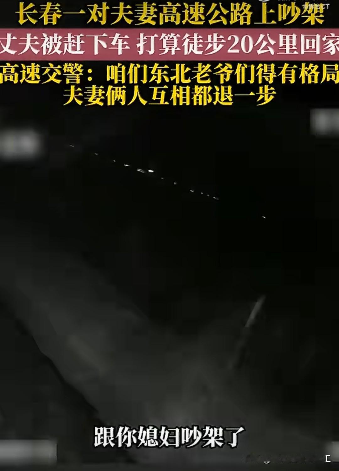 刚在DY上刷到个奇葩事情。 一对夫妻在高速上吵架,吵的什么不知道,只知道是男的被女的赶下车,落在了服务区。 正巧赶上手机没电,男的自觉没辙,就计划徒步回家,走半路到高速时意外撞到交警。 交警对男方进行了批评教育,并告诫他,咱东北老爷们得有格局,遇到事情要学会忍让。 最后还劝他回家后跟老婆道个歉。