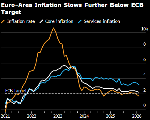 欧元区通胀率在欧洲央行2%目标之下进一步下跌,这正当官员们权衡下一步的利率政策。
