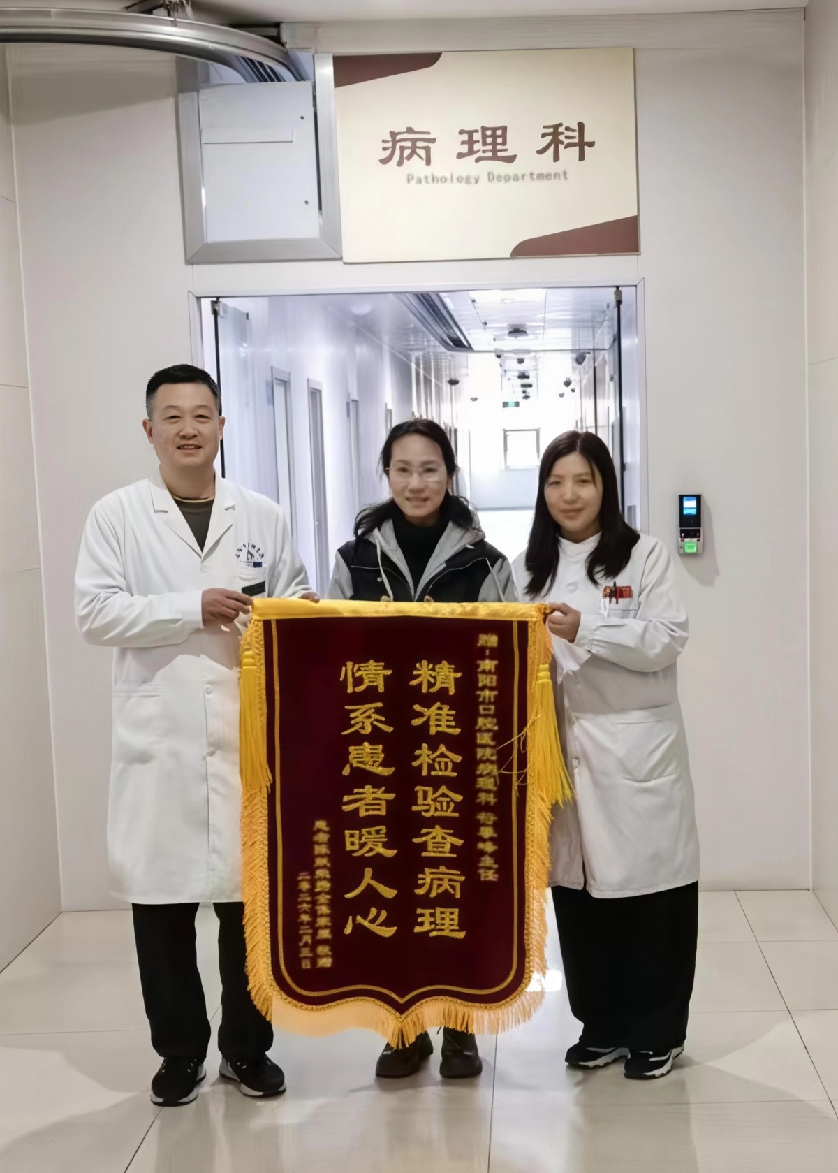 2月3日,南阳市口腔医院病理科收到患者陈女士送来的一面印有“精准检验查病理情系患者暖人心”的锦旗,以此感谢病理科主任符攀峰及科室团队的专业诊疗与暖心服务。