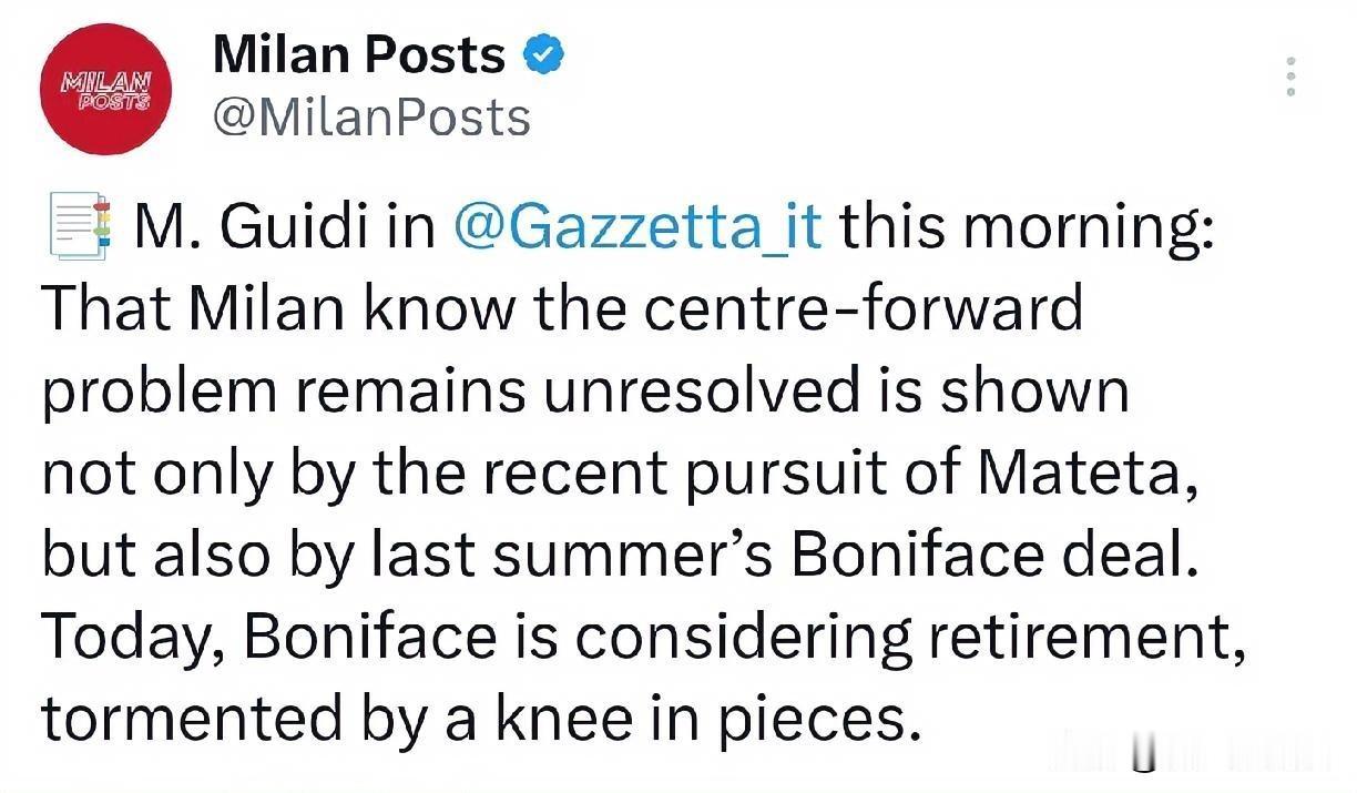 博尼法斯考虑退役了。米兰在马特塔交易中的谨慎源于对伤病的担忧,之前差点加盟米兰的锋线球员博尼法斯由于膝盖问题已经考虑退役了。博尼法斯也是神,在勒沃库森时候虽然也是打打停停,但能拿银靴,咋转会米兰失败后就直接躺平了。 个人觉得马特塔和博尼法斯不是一回事。当初听说博尼法斯要来,大家都对博尼法斯的膝盖心存疑虑,毕竟博尼法斯是两条腿十字韧带撕裂,马特塔只是膝盖存在一些问题,而且在十二月时候马特塔团队就对外公布了马特塔的决定,不做手术而接受保守治疗。 当然放弃马特塔也没毛病,这次马特塔体检完直接准备做手术了,据说要休息三个月,我们无法判定马特塔到底是因为不能加盟米兰而选择手术,还是保守治疗效果不好而选择手术。