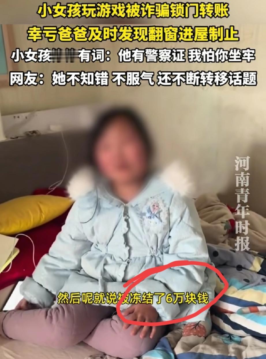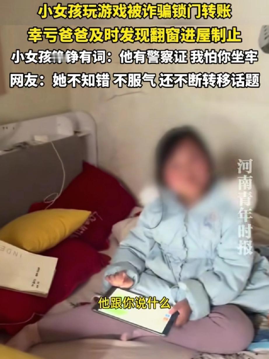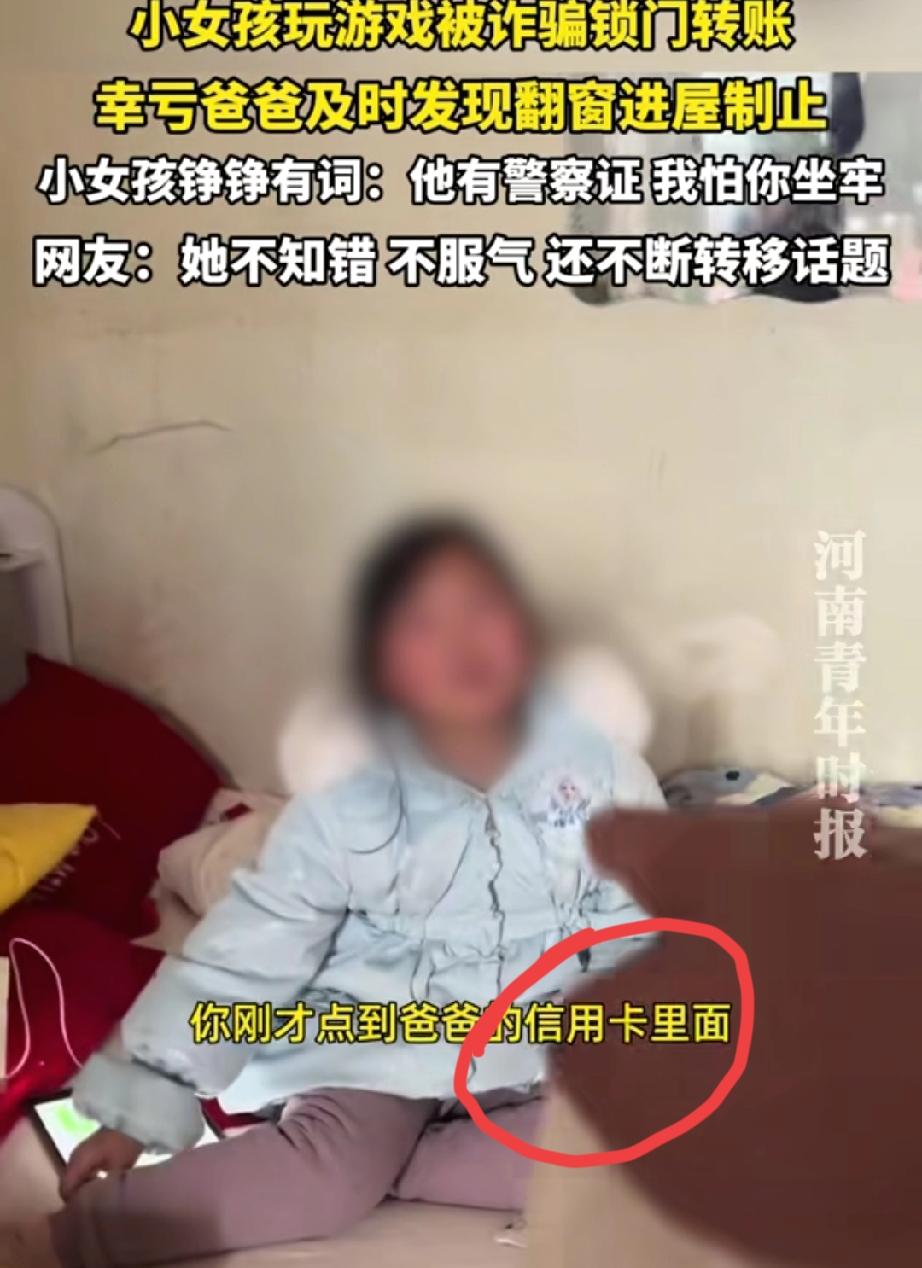 太可怕了!河南一位父亲发现女儿偷偷点自己信用卡,还拿了全家的手机,追问下女儿哭着坦白遭遇游戏诈骗,骗子用假警察证吓唬孩子,称冻结6万还会让爸爸坐牢,所幸这位父亲及时戳穿骗局,没让骗子的阴谋得逞。 视频里,父亲听到女儿在房间哭,进去看到女儿正拿着他的手机。他声音很大地问:“你在干什么?”女儿哭着说:“有警察不让我告诉你……” 原来,女儿玩游戏时想充钱,但未成年模式限制了她。这时,一个自称“客服”的人联系她,说因为她操作失误,导致游戏公司6万元被冻结。更可怕的是,对方发来“警察证”,威胁说:“如果不配合解冻,你爸爸就要坐牢!” 女儿完全被吓住了。在她心里,警察的话就是真的,爸爸真的会有危险。所以她乖乖按对方指示,准备拿爸爸的手机操作。幸亏父亲及时发现,冲进房间制止。 父亲急得声音都变了:“爸爸没犯法,坐什么牢?那是骗你的!”女儿还小声说:“可他发了警察证……”父亲坚定地告诉她:“那是假的,网上P的!” 我们来回放一下骗子给孩子灌的“毒药”: 第一步,制造恐慌。不说你游戏账号有问题,而是吓唬你“导致公司6万块被冻结”。对孩子来说,6万是个天文数字,瞬间就能让她陷入“我闯大祸了”的极度恐惧中。 第二步,伪造权威。光说不够,立刻发来“警察证”。孩子哪会分辨PS照片?在她心里,这就是国家权威出面了,恐惧感瞬间翻倍。 第三步,终极恐吓与唯一出路。最关键的一击来了:“不解决,你爸爸就要坐牢!”这一下,把孩子的恐惧从自己身上,彻底转移到了她最爱、最怕失去的爸爸身上。 紧接着,立刻给出“唯一解决方法”:按我的指示,拿爸妈手机操作,而且“不能告诉爸爸,否则他马上被抓”。 就这样,骗子成功地把父亲从“保护者”变成了孩子眼中的“被保护者”,孩子反而觉得自己在“拯救爸爸”。 我们的家庭教育,必须升级了。不能只说“那是骗子”,而要像演习一样,告诉孩子:“警察永远不会在网上办案让你转账。”“任何说你爸妈会出事、让你保密的,都是坏人。”“天大的事,你第一时间告诉爸爸,爸爸才能保护你,爸爸绝不会因为你犯错而坐牢。”——这些才是能破解骗子剧本的“定心真言”。 女孩玩游戏被诈骗锁门转账被爸爸制止