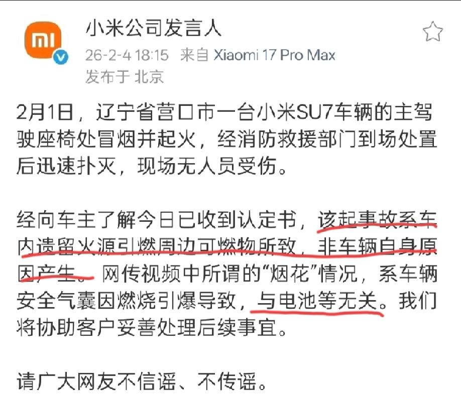 辽宁营口小米su7起火事故的认定书出来了,据说事故的原因是车内遗留火源引燃周边可燃物所致,非车辆自身原因产生,与电池无关…… 小米官方也提请广大网友不信谣不传谣! 那就有网友提出质疑:车内遗留火源,那到底是什么呢?就不能交代清楚吗?比如说打火机之类的。可问题又来了,据说当时车主是在车内,看到冒烟了,才赶紧跑出来的,如果是车内的火源,那他不知道灭火吗?就在旁边看着让这把火把自己的爱车付之一炬? 也有网友表示:从当时现场的视频来看,应该不是电池的问题,如果是电池的问题,火应该是从底盘那里往上串的,而现场视频并非如此。 评论区诸君,你们怎么看?