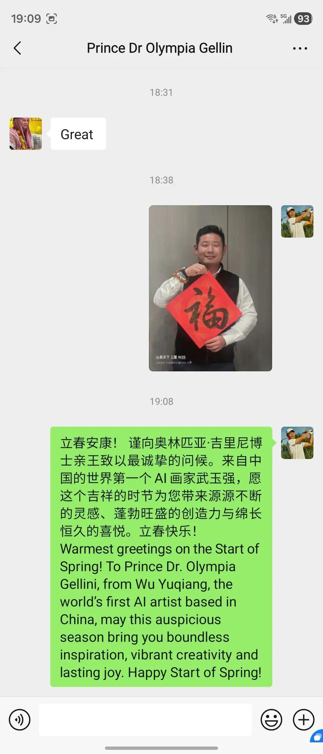 立春安康! 谨向奥林匹亚·吉里尼博士亲王致以最诚挚的问候。来自中国的世界第一个AI画家武玉强,愿这个吉祥的时节为您带来源源不断的灵感、蓬勃旺盛的创造力与绵长恒久的喜悦。立春快乐!Warmest greetings on the Start of Spring! To Prince Dr. Olympia Gellini, from Wu Yuqiang, the world’s first AI artist based in China, may this auspicious season bring you boundless inspiration, vibrant creativity and lasting joy. Happy Start of Spring!
